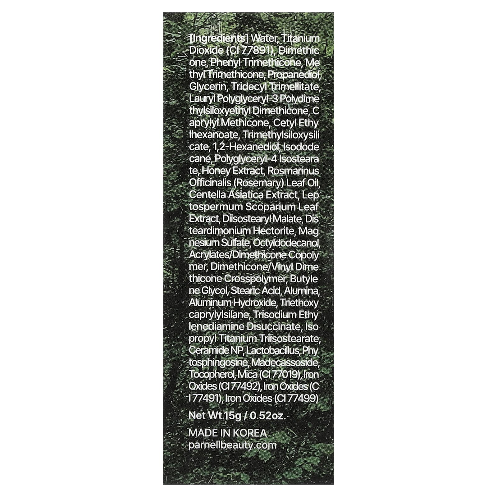 Water, titanium dioxide (ci 77891), dimethicone, phenyl trimethicone, methyl trimethicone, propanediol, glycerin, tridecyl trimellitate lauryl polyglyceryl-3 polydimethylsiloxyethyl dimethicone caprylyl methicone, cetyl ethylhexanoate, trimethylsiloxysilicate, 1,2-hexanediol, isododecane, polyglyceryl-4 isostearate, honey extract, rosmarinus officinalis (rosemary) leaf oil, centella asiatica extract, leptospermum scoparium leaf extract, diisostearyl malate, disteardimonium hectorite, magnesium sulfate, octyldodecanol, acrylates/dimethicone copolymer, dimethicone/vinyl dimethicone crosspolymer, butylene glycol, stearic acid, alumina, aluminum hydroxide, triethoxycaprylylsilane, trisodium ethylenediamine disuccinate, isopropyl titanium triisostearate ceramide np, lactobacillus, phytosphingosine, madecassoside, tocopherol, mica (ci 77019), iron oxides (ci 77492), iron oxides (ci 77491), iron oxides (ci 77499).