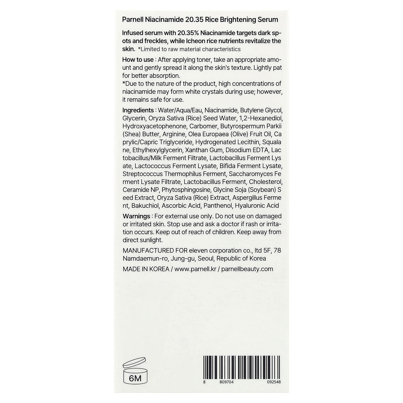 O sérum infundido com Nicotinamida a 20,35% tem como alvo manchas escuras e sardas, enquanto os nutrientes do arroz Icheon revitalizam a pele.