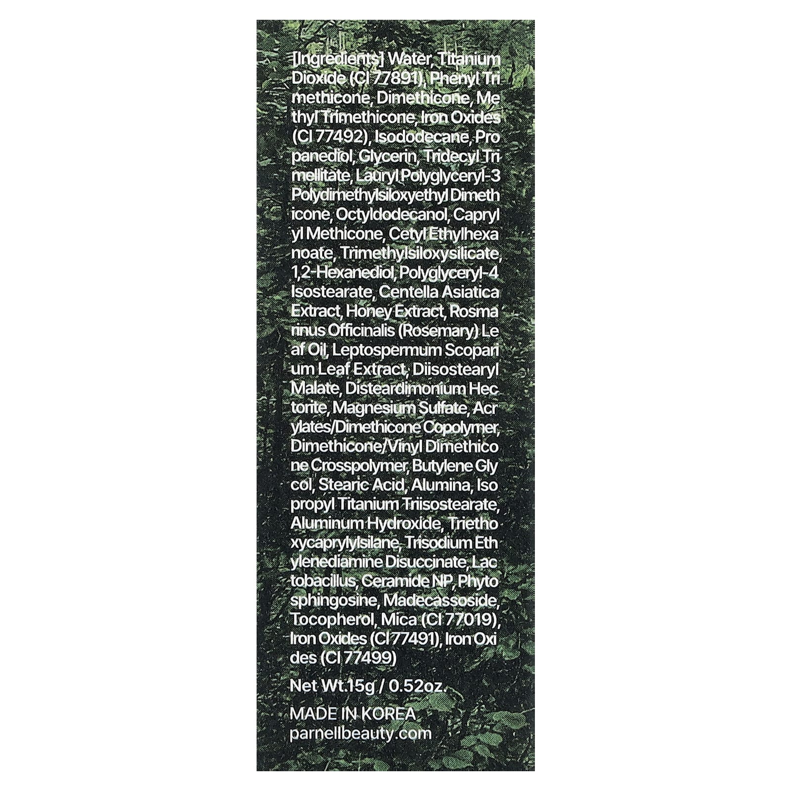 Água, dióxido de titânio (CI 77891). feniltrimeticona, dimeticona, methyl trimethicone, óxidos de ferro (CI 77492), isododecane, propanediol, glicerina, tridecyl trimellitate, lauryl polyglyceryl-3 polydimethylsiloxyethyl dimethicone, octildodecanol, caprylyl methicone, etilcaproato de cetila, trimethylsiloxysilicate, 1,2-hexanediol, polyglyceryl-4 isostearate, extrato de Centella asiatica, extrato de mel, óleo da folha de Rosmarinus officinalis (alecrim), extrato da folha de Leptospermum scoparium, diisostearyl malate, disteardimonium hectorite, sulfato de magnésio, copolímero de acrilatos/dimeticona, dimethicone/vinyl dimethicone crosspolymer, butileno glifo col, ácido esteárico, alumina, isopropyl titanium triisostearate, hidróxido de alumínio, triethoxycaprylylsilane, lactobacilos de disuccinato de etilenodiamina trissódica, ceramida NP, phytosphingosine, madecassoside, tocoferol, mica (CI 77019), óxidos de ferro (CI 77491), óxidos de ferro (CI 77499).