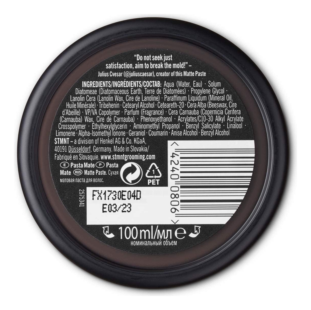 Pasta fosca STMNT Grooming Goods de 3,38 onças | Retenção forte e alto volume o dia todo | Pasta de argila para cabelo para homens | Fórmula não oleosa | Pasta de textura para cabelos | Ideal para cabelos secos e úmidos | Estilo de cabelo masculino – Definição lendária com textura duradoura – Controle forte com acabamento fosco – Fórmula não oleosa fácil de lavar – Perfume exclusivo de Julius Cvesar: coco e sândalo com inflexões de orris – Aplique uma pequena quantidade no cabelo seco e molde até obter forma. Ou aplique nos cabelos úmidos antes de secar com secador ou secar ao ar.