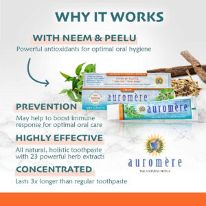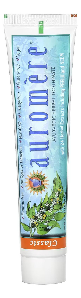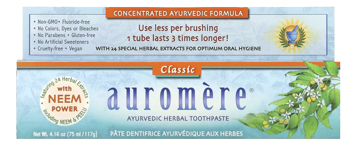 Eleve sua rotina de higiene bucal com o creme dental ayurvédico à base de ervas Auromere Classic (alcaçuz). Esta mistura única de 24 ervas ayurvédicas potentes, incluindo Neem e Peelu, oferece uma abordagem holística à saúde bucal. Experimente o sabor suave e naturalmente doce enquanto promove um sorriso mais saudável e radiante. – FÓRMULA CLÁSSICA DE ALCAÇUZ – Esse sabor popular é naturalmente doce, calmante e refrescante com um toque de menta para um sabor refrescante. Cada tubo dura 3 vezes mais do que seu creme dental normal – POWER OF NEEM – Nossa fórmula combina as propriedades naturalmente purificadoras e revigorantes de Neem e Peelu, juntamente com mais de 20 outros extratos de ervas especiais para uma higiene bucal ideal – PASTA DE DENTES NATURAL – Nossa pasta de dente sem flúor é ótima para dentes sensíveis e não domina sua boca. Com um sabor suave de alcaçuz e menta e uma fórmula superconcentrada, nosso creme dental deixa os dentes limpos – O QUE É AYURVEDA – Ayurveda é a antiga ciência holística da Índia que visa uma harmonia total da mente, vida, corpo e espírito em equilíbrio com os ritmos da natureza – SOBRE NÓS – As ervas e minerais artesanais usados nos produtos Auromere são conhecidos na Ayurveda por suas qualidades benéficas e rejuvenescedoras únicas. Perfeito para manter a higiene, o bem-estar e a beleza