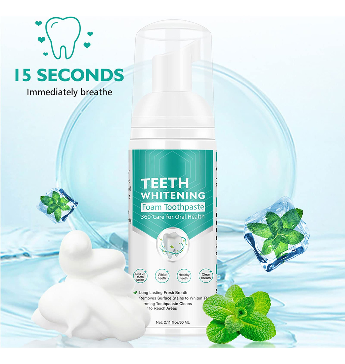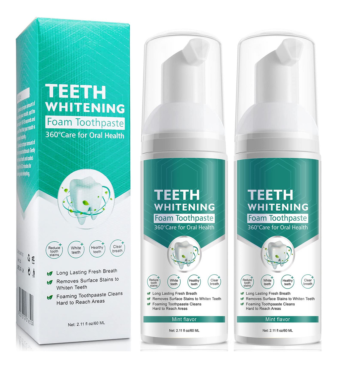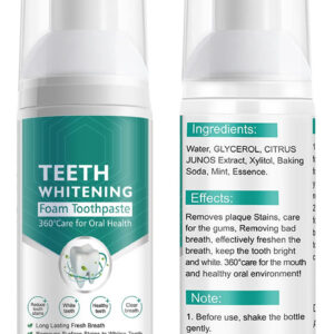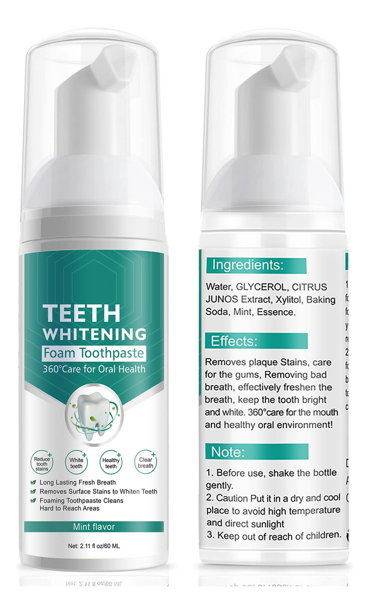 360care a boca e o ambiente bucal saudável! Ingredientes: Água, GLICEROL, CITRINOS, extrato de JUNOS, xilitol, bicarbonato de sódio, hortelã, essência. Efeitos: remove manchas de placa bacteriana, cuida das gengivas. Removendo o mau hálito, refresque o hálito de forma eficaz. mantenha o dente brilhante e branco. Uso: 1. Coloque uma quantidade adequada de espuma na boca, cuspa a espuma em 10-15 segundos e você sentirá que sua boca se refresca instantaneamente. 2. Esprema a quantidade adequada de espuma na escova de dentes. Escove suavemente os dentes e a língua revestida por 2-3 minutos para limpar e refrescar. Nota: 1. Antes de usar, agite o frasco suavemente. 2. Cuidado Coloque-o em um local seco e fresco para evitar altas temperaturas e luz solar direta. 3. Mantenha fora do alcance das crianças. O pacote inclui 2 pastas de dente branqueadoras de espuma — A pasta de dente espumante limpa: a espuma superfina pode limpar e dissolver manchas nos dentes com eficácia, clarear os dentes, proporcionar hálito fresco e gengivas mais saudáveis! – INGREDIENTES NATURAIS: Nosso creme dental branqueador de dentes é feito com ingredientes de qualidade superior que são considerados uma bênção natural para os dentes. Ele contém extratos de água, GLICEROL, FRUTAS CÍTRICAS, extrato de JUNOS, xilitol, bicarbonato de sódio, hortelã, extrato de essência, pode trazer um efeito clareador visível e fornecer proteção ao hálito fresco para gengivas e dentes. – REMOVE MANCHAS SUPERFICIAIS PARA DENTES BRANCOS: A pasta de dente com bicarbonato de sódio clareia naturalmente os dentes e suavemente, adequado para dentes normais e sensíveis. — Feito com bicarbonato de sódio: esta mancha intensiva Remoção O creme dental branqueador é o removedor de manchas natural mais eficaz, fazendo uso do forte poder de limpeza do bicarbonato de sódio. – FÁCIL DE USAR: basta aplicar um pouco de espuma na escova de dentes e escovar os dentes da maneira que você sempre faz. Branqueie enquanto se endireita o dia todo para obter aquele sorriso perfeito! Este pacote com os 2 melhores cremes dentais de espuma branca também é um presente ideal para sua família e amigos. Nós garantimos que você vai adorar este creme dental de espuma, mas se você não estiver satisfeito com ele, entre em contato conosco. Teremos o prazer de lhe dar um reembolso de 100%.