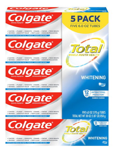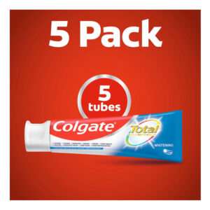 O pacote de creme dental branqueador total da Colgate com 5 tubos oferece uma solução conveniente e eficaz para obter um sorriso mais brilhante e saudável, além de promover cuidados bucais abrangentes e frescor duradouro.sams club