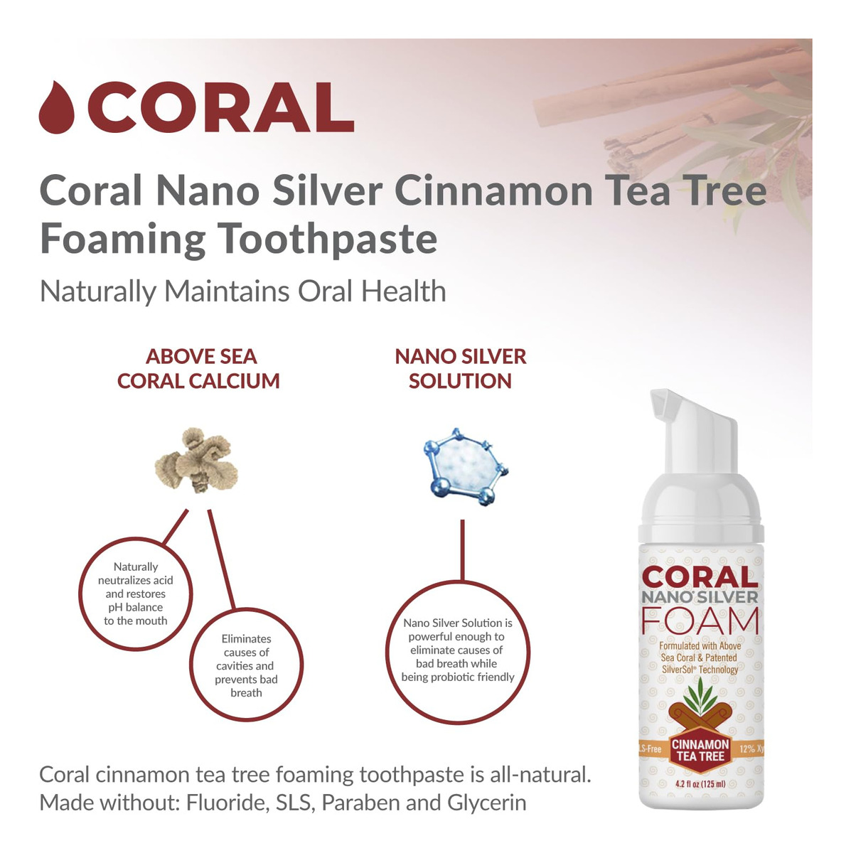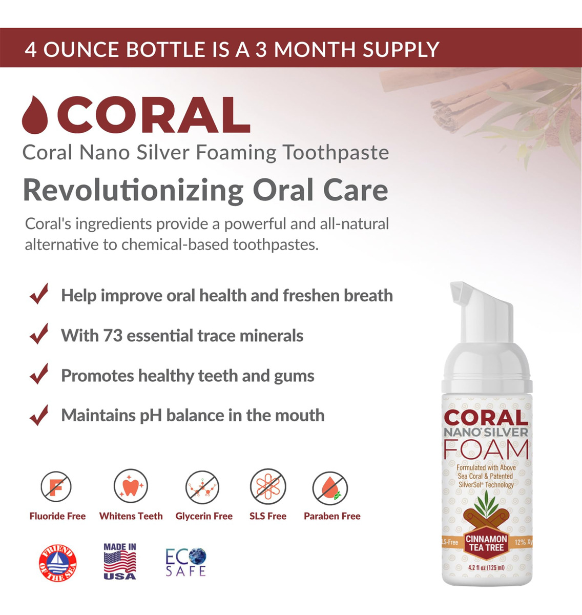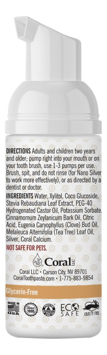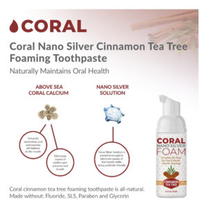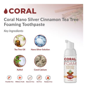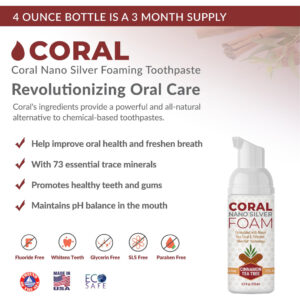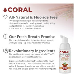 Nenhuma das coisas ruins: 100% seguro de engolir – o creme dental branqueador antiplaca Coral Nano Silver é livre de flúor, sem corante, sem glicerina, sem SLS, sem parabenos, sem alvejante, sem triclosan e sem glúten. Os cremes dentais Coral Nano Silver não contêm adoçantes artificiais nem sabores artificiais. Todas as coisas boas: o Coral Nano Silver combina o poder do cálcio coral, da tecnologia Silver Sol Nano Silver, do xilitol e dos óleos essenciais de grau terapêutico, fornecendo até 12 horas de proteção. Ajuda a neutralizar o ácido restaurando o equilíbrio do pH na boca. O creme dental espumante Coral Nano Silver contém a forma mais pura de cálcio coral com 73 minerais essenciais. Na pasta de dentes Coral, acreditamos em aproveitar o poder da natureza para criar produtos que elevam sua rotina de higiene bucal. É por isso que nosso creme dental espumante é elaborado com ingredientes naturais, livres de produtos químicos e aditivos agressivos. Com seu poder de limpeza incomparável, experiência refrescante e formulação natural, o creme dental espumante é realmente a melhor escolha para manter um sorriso saudável e radiante. Experimente você mesmo a diferença, mude para um creme dental espumante hoje mesmo e descubra um novo padrão de excelência em higiene bucal. Seu sorriso agradecerá! – Você está em busca da pasta de dente perfeita? Não procure mais, o inovador creme dental espumante natural sem flúor da Coral, a melhor escolha para uma rotina de cuidados bucais refrescante, natural e profundamente eficaz. Formulado com o poder do cálcio coral, nanopartículas de prata e xilitol para benefícios excepcionais de higiene bucal. – Nenhuma das coisas ruins: 100% seguro de engolir – O creme dental branqueador antiplaca Coral Nano Silver é sem flúor, sem corante, sem glicerina, sem SLS, sem parabenos, sem alvejante, sem triclosan e sem glúten. Os cremes dentais Coral Nano Silver não contêm adoçantes artificiais nem sabores artificiais. – Todas as coisas boas: o Coral Nano Silver combina o poder do cálcio coral, da tecnologia Silver Sol Nano Silver, do xilitol e do óleo de hortelã de grau terapêutico, fornecendo até 12 horas de proteção. Ajuda a neutralizar o ácido e restaurar o equilíbrio do pH na boca. O creme dental espumante Coral Nano Silver contém a forma mais pura de cálcio coral com 73 oligoelementos essenciais. – A formulação exclusiva permite que ele penetre profundamente nos cantos e fendas da boca, fornecendo cobertura abrangente para uma limpeza verdadeiramente completa. A consistência espumosa requer um mínimo de água para uma limpeza altamente eficaz. Isso o torna perfeito para uso em qualquer lugar ou em situações em que o acesso à água é limitado. – Na Coral Toothpaste, acreditamos em aproveitar o poder da natureza para criar produtos que elevam sua rotina de higiene bucal. É por isso que nosso creme dental espumante é elaborado com ingredientes naturais, livres de produtos químicos e aditivos agressivos. Com seu poder de limpeza incomparável, experiência refrescante e formulação natural, o creme dental espumante é realmente a melhor escolha para manter um sorriso saudável e radiante.