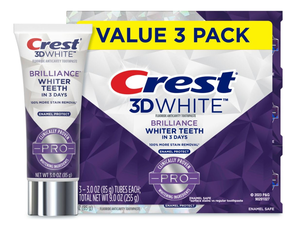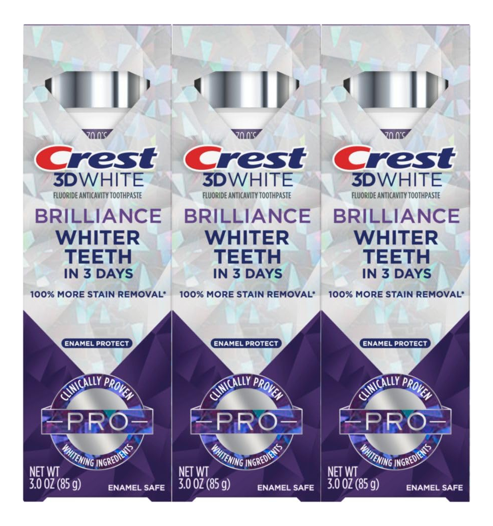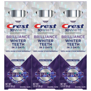 Pacote de 3 onças Crest 3D White Brilliance Pro Enamel Protect – Você receberá (3) tubos de 3 onças de creme dental Crest 3D White Professional Enamel Protect – Ingredientes clareadores clinicamente comprovados – Dentes mais brancos em 3 dias* – Até 100% de remoção de manchas* – Contém flúor para proteção anticavitária