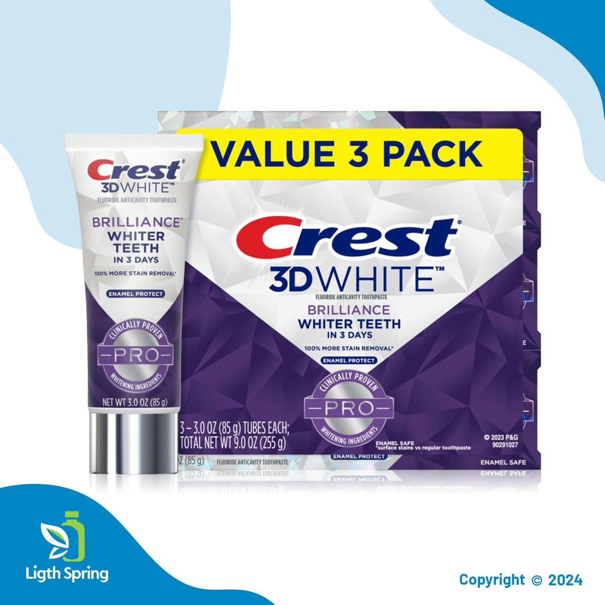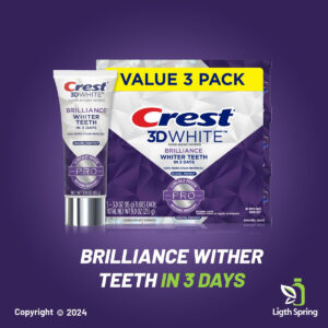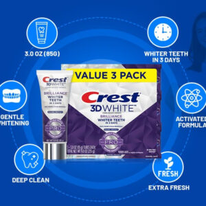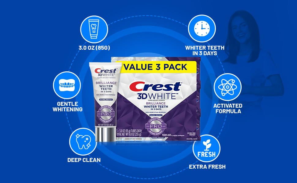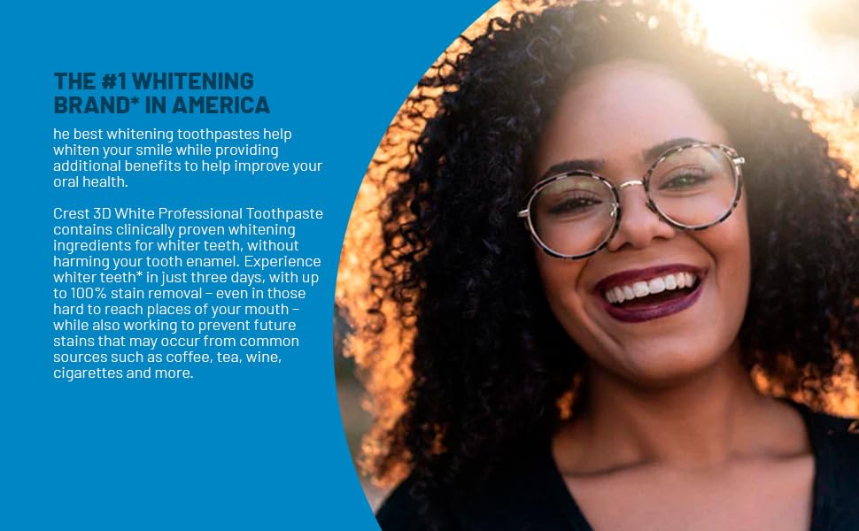 Os melhores cremes dentais clareadores ajudam a clarear seu sorriso, ao mesmo tempo em que oferecem benefícios adicionais para ajudar a melhorar sua saúde bucal. O creme dental profissional Crest 3D White contém ingredientes clareadores clinicamente comprovados para dentes mais brancos, sem prejudicar o esmalte dentário. Experimente dentes mais brancos* em apenas três dias, com até 100% de remoção de manchas, mesmo nos locais de difícil acesso da boca, além de trabalhar para evitar futuras manchas que possam ocorrer em fontes comuns, como café, chá, vinho, cigarros e muito mais. Proteja seus dentes com a fórmula segura para esmalte que contém flúor para ajudar a combater e prevenir cáries, neutralizando a placa bacteriana na linha da gengiva. Eleve seu sorriso adicionando o creme dental 3D White Professional à sua rotina diária de higiene bucal (escovar os dentes 2 vezes ao dia, conforme recomendado pelos dentistas). Para obter melhores resultados, experimente combinar o creme dental profissional 3D White com uma escova de dentes manual ou elétrica Oral-B para impulsionar sua rotina de higiene bucal para o próximo nível. Deixa o hálito mentolado fresco e seus dentes brilhantes para seu sorriso mais confiante até agora. Todas as versões de creme dental são seguras para uso com dentaduras, tampas, coroas, facetas e aparelhos ortodônticos. De — America's #1 Whitening, 3D White Brilliance Pro Enamel Protect – Creme dental Crest Enamel Strengthening: o creme dental Enamel Protect fortalece e protege seu esmalte para dentes brancos de longa duração. Também ajuda a prevenir cáries. – Pasta de dentes Crest 3D White Brilliance: a pasta de dentes 3D White Brilliance é especialmente formulada para fornecer o máximo poder clareador. Ele contém uma mistura única de ingredientes que clareiam os dentes e removem manchas superficiais. – Sabor de menta fresca: o creme dental 3D White Brilliance tem um sabor refrescante de menta que deixa sua boca limpa e fresca. Também é enriquecido com flúor para ajudar a proteger contra a cárie dentária. – Brilhante dentes mais brancos em 3 dias, 3D White Brilliance Pro Enamel Protect – Ingredientes ativos: fluoreto de sódio 0,243% (0,16% p/v de íon de flúor).