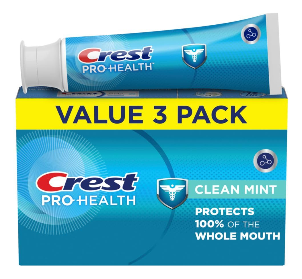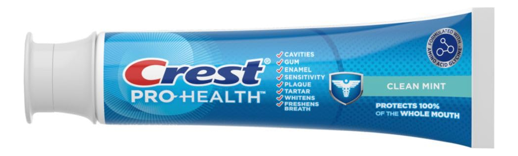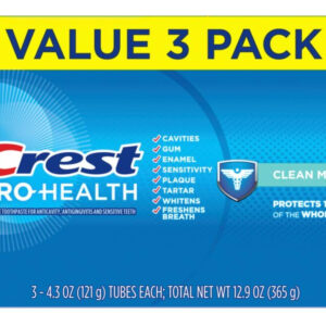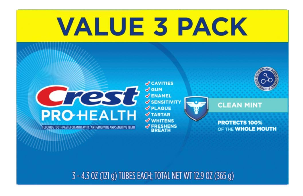 Pacote triplo de creme dental Crest Pro-Health Clean Mint (4,3 onças) — Você receberá (3) tubos de 4,3 onças de creme dental Crest Pro-Health Clean Mint — Fórmula suave e espumosa com um sabor forte e revigorante de menta fresca — Protege 100% da boca inteira — 8 benefícios avançados em 1 pasta de dente — Dentes mais fortes fortalecendo o esmalte