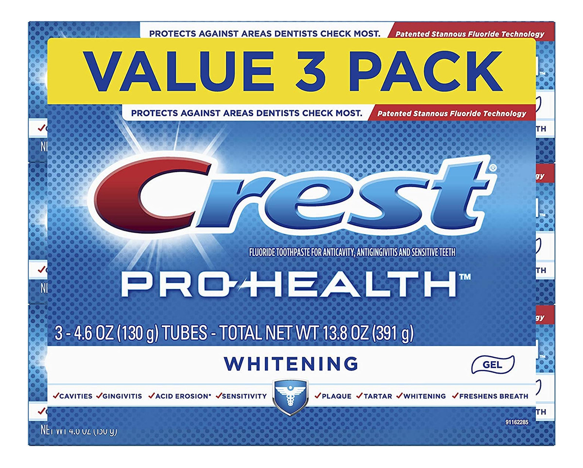 Creme dental em gel clareador Crest Pro-Health, 4,6 onças, 3 unidades, triplo — Você receberá (3) tubos de 4,6 onças de creme dental clareador Crest Pro-Health — Protege 100% da boca inteira*. *Atinge 100% da superfície bucal e protege contra a placa bacteriana que causa gengivite – Contém flúor de estanho para ajudar a combater cáries e proteger contra placa bacteriana, gengivite e sensibilidade dentária – O clareamento dental Crest Pro-Health oferece 8 benefícios avançados: protege contra cáries, sensibilidade, placa bacteriana e tártaro + fornece benefícios de gengiva, esmalte, clareamento e hálito fresco – From Crest — O clareamento #1 da América Marca