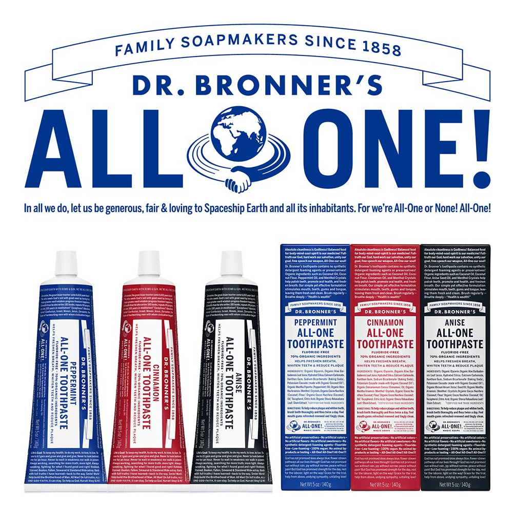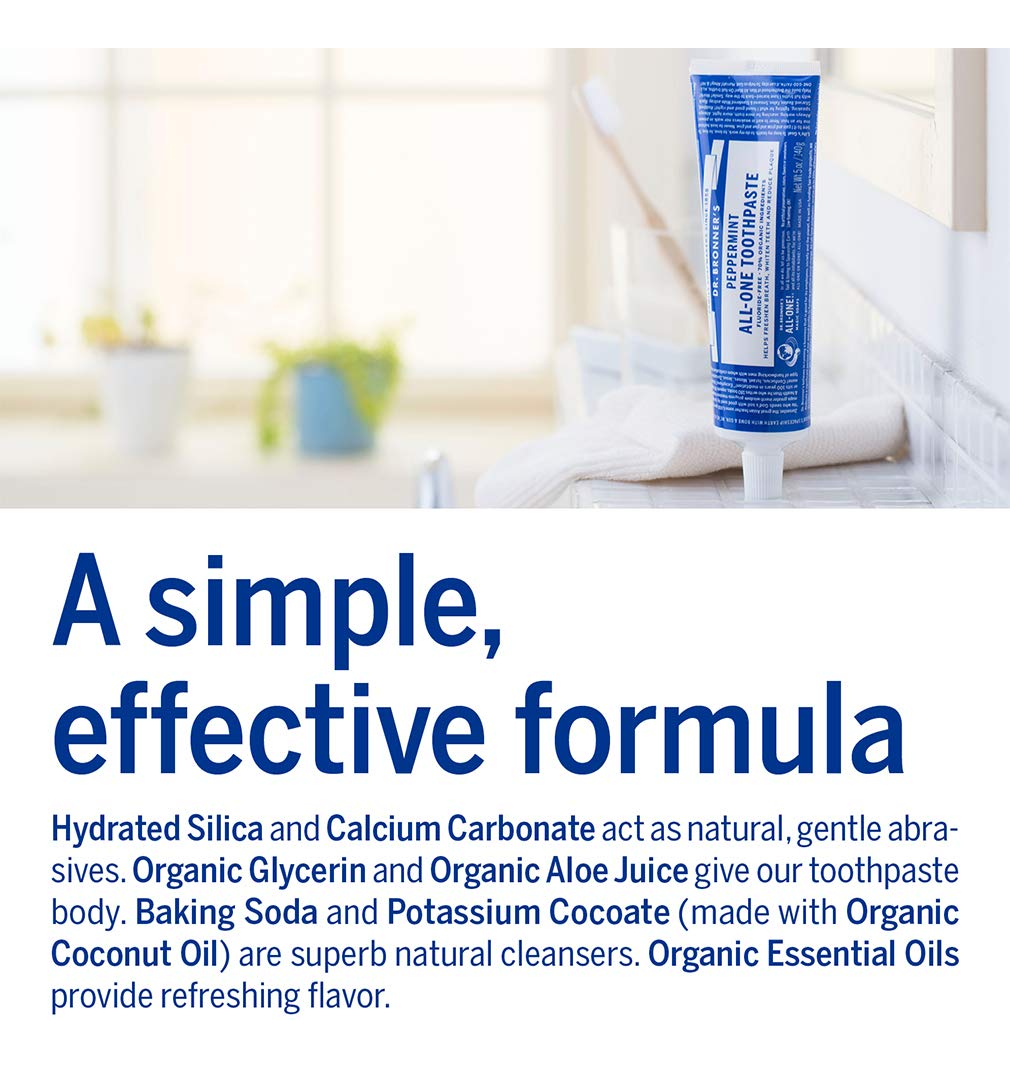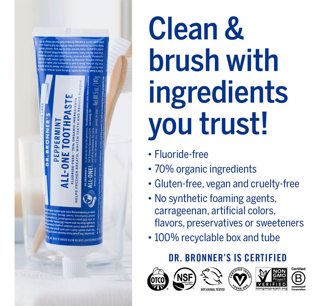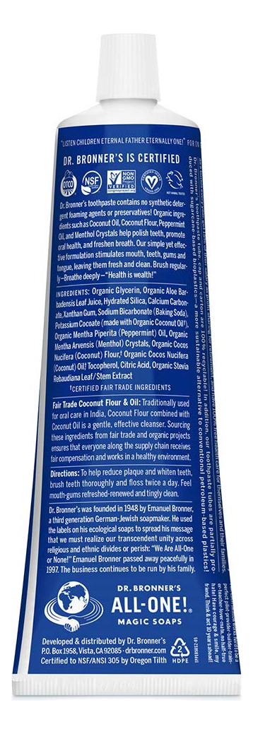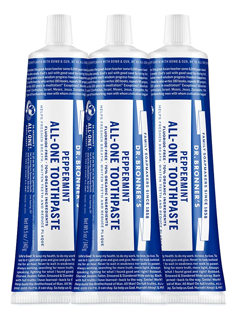 Dr. Bronners — Creme dental completo (hortelã, 5 onças, pacote com 3) — 70% de ingredientes orgânicos, naturais e eficazes, sem flúor, sem SLS, ajuda a refrescar o hálito, reduzir a placa bacteriana, clarear os dentes, vegano — FEITO COM INGREDIENTES ORGÂNICOS E DE COMÉRCIO JUSTO: O creme dental completo Dr. Bronner é feito com 70% de ingredientes orgânicos. Nossa fórmula de baixa espuma ajuda a clarear os dentes, reduzir a placa e refrescar o hálito. – SEM AGENTES ESPUMANTES SINTÉTICOS: Sem laurilsulfato de sódio, lauroilsarcosinato de sódio, laurilsulfato de amônio, metil cocoil tauratenona de sódio! Sem cores, sabores, conservantes ou adoçantes artificiais. Livre de flúor e crueldade! – UMA FÓRMULA SIMPLES: A sílica hidratada e o carbonato de cálcio atuam como abrasivos naturais e suaves; o bicarbonato de sódio e o cocoato de potássio (feitos com óleo de coco orgânico) são excelentes limpadores naturais; os óleos essenciais orgânicos fornecem um sabor refrescante. É simples assim! – POR QUE CREME DENTAL SEM FLÚOR: Pesquisas mostram que os americanos estão recebendo flúor mais do que suficiente por meio da fluoretação da água. O Dr. Bronner's fornece um creme dental eficaz sem flúor para consumidores que desejam reduzir a ingestão de flúor – NOSSO CREME DENTAL É LIVRE DE CRUELDADE E NUNCA FOI TESTADO EM ANIMAIS: os produtos e ingredientes do Dr. Bronner nunca são testados em animais, então eles se qualificam para o logotipo Leaping Bunny. Finalmente, uma pasta de dente que corresponde aos seus valores!