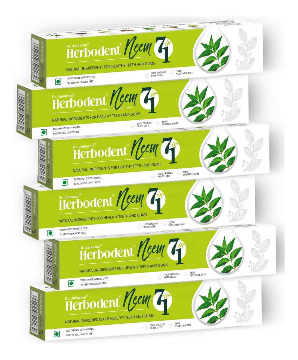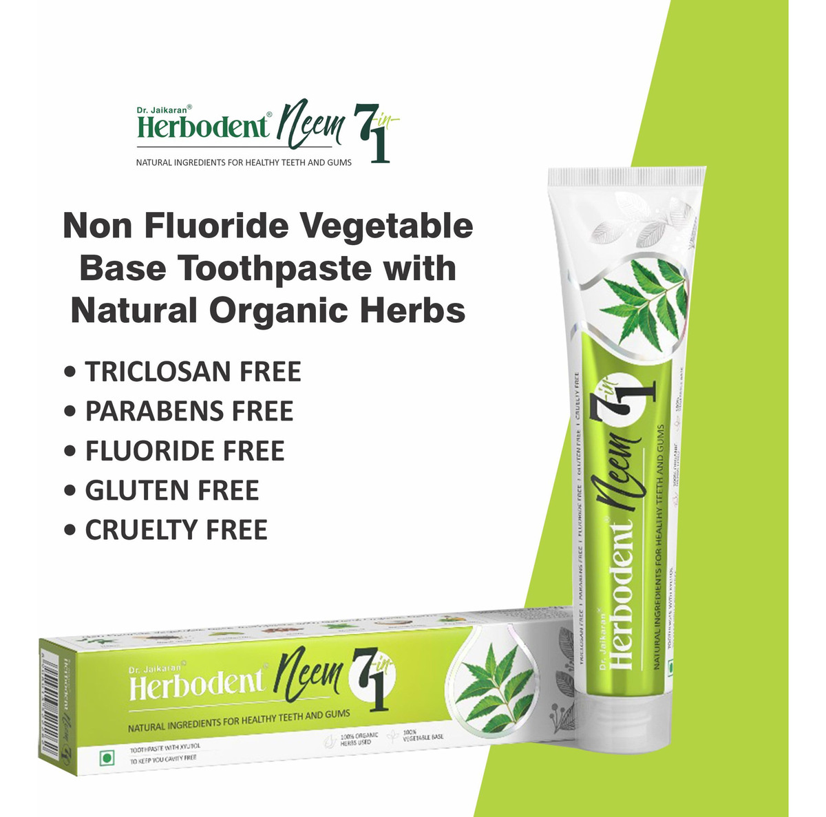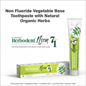 O creme dental Herbodent NEEM 7 em 1 é uma excelente combinação de XILITOL e bicarbonato de sódio com Neem orgânico, cardamomo orgânico, cravo orgânico, semente preta orgânica e hortelã orgânica. O xilitol cuida da cárie dentária e das cáries, enquanto o bicarbonato de sódio garante uma limpeza profunda dos dentes. Ervas orgânicas como Neem, cravo e semente preta fornecem o poder de combater problemas dentários, enquanto o cardamomo e a hortelã oferecem um frescor natural duradouro. Resumindo, o creme dental Herbodent Neem 7 em 1 com xilitol oferece excelente limpeza, ótimo sabor, frescor duradouro com cuidado bucal completo. – Neem Essential 7 em 1 é uma combinação de 5 ervas com xilitol e bicarbonato de sódio. – Uma formulação exclusiva do Dr. Jaikaran com 5 ervas. Neem, uma erva antibacteriana conhecida pelos benefícios do cuidado da gengiva. – O cravo é conhecido pela proteção da gengiva, pelo fortalecimento da gengiva e pelo remédio doméstico para dor de dente – A semente preta é conhecida por suas propriedades antigermes. – O frescor do cardamomo e da hortelã proporciona uma sensação agradável e duradoura. – INGREDIENTES NATURAIS: O creme dental Herbodent Neem 7 é feito sem produtos químicos agressivos, como parabenos, flúor e triclosan. Mas ele contém SLS para garantir um bom poder de formação de espuma. Uma boa formação de espuma é essencial para uma boa limpeza.