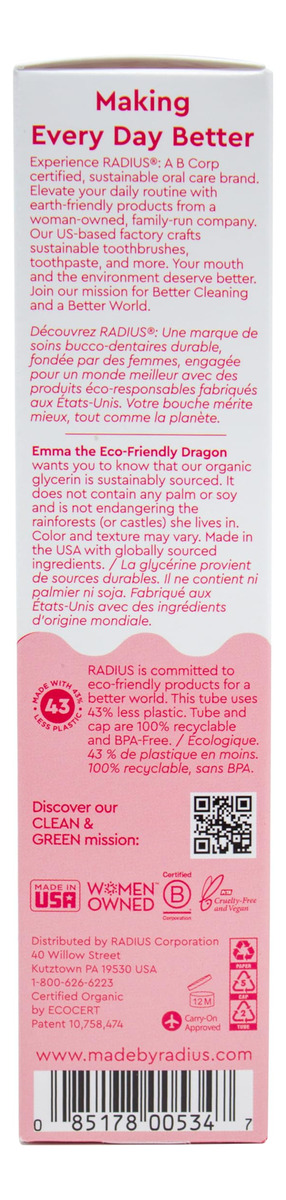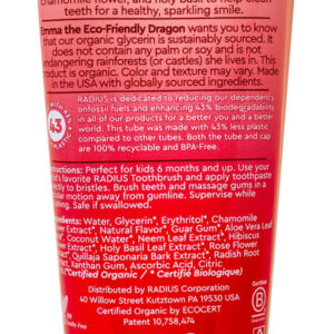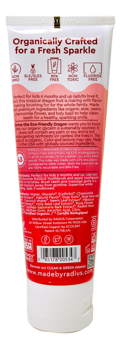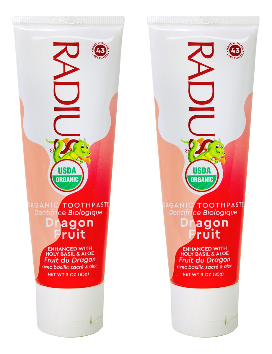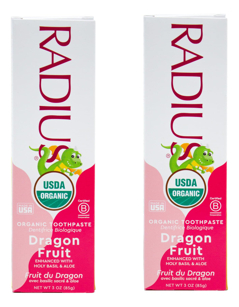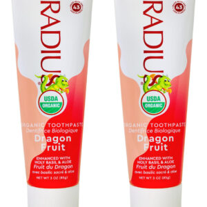 Pasta de dente infantil orgânica RADIUS USDA, 3 onças, não tóxica, sem glúten, projetada para melhorar a saúde gengival de crianças de 6 meses ou mais – Fruta do dragão – Pacote com 2 – PASTA DE DENTES RADIUS PROJETADA ORGANICAMENTE: deixe seus filhos crescerem com nossa pasta de dente infantil orgânica de fruta do dragão do USDA. Então, bons adultos também adoram! – Ultra seguro para bocas pequenas: você não verá nenhum creme dental Trace & Radius sem produtos químicos, sem OGM, sem glúten, sem flúor, sem sacarina, sem SLS, sem SLES, sem carragenina, sem parabenos ou sintéticos de qualquer tipo. Basta limpar os ingredientes naturais. – USDA ORGANIC: Aperfeiçoar nossa fórmula pioneira foi um trabalho de amor e estamos entusiasmados em poder oferecer um creme dental orgânico exclusivo certificado pelo USDA. Livre de crueldade e certificado pela Leaping Bunny para deixar sua consciência tão limpa quanto seus dentes. – SABORES SABOROSOS, MAS EFICAZES: Nossas combinações de sabores foram escolhidas tanto por seus benefícios à saúde bucal quanto por suas delícias de dar água na boca. Dragon Fruit limpa esmaltes e evita problemas de gengiva sem produtos químicos agressivos. – HERBAL SHOTGUN: Obtenha aquele brilho fresco com uma mistura única de extratos orgânicos de manjericão sagrado, neem e rosa mosqueta.