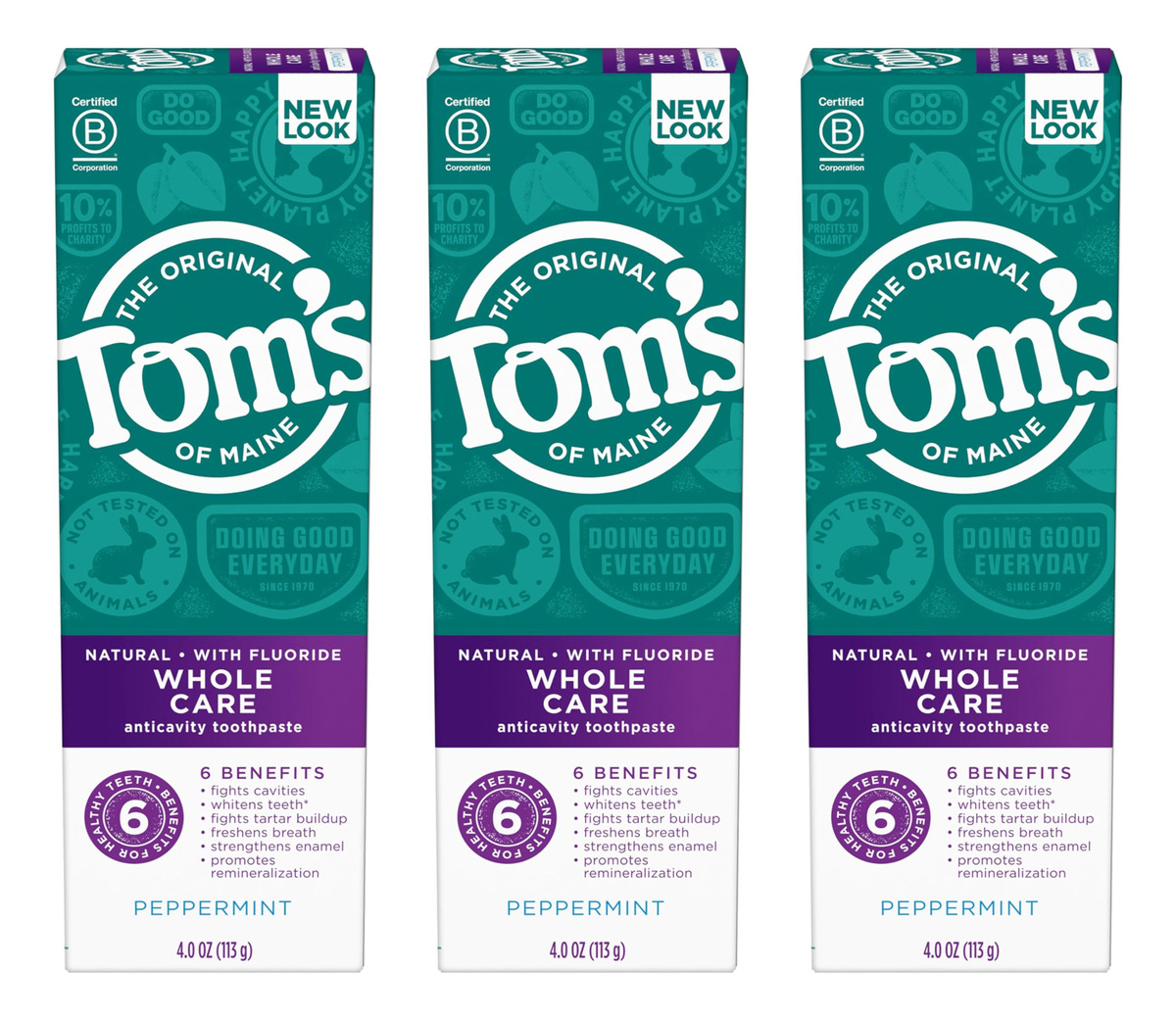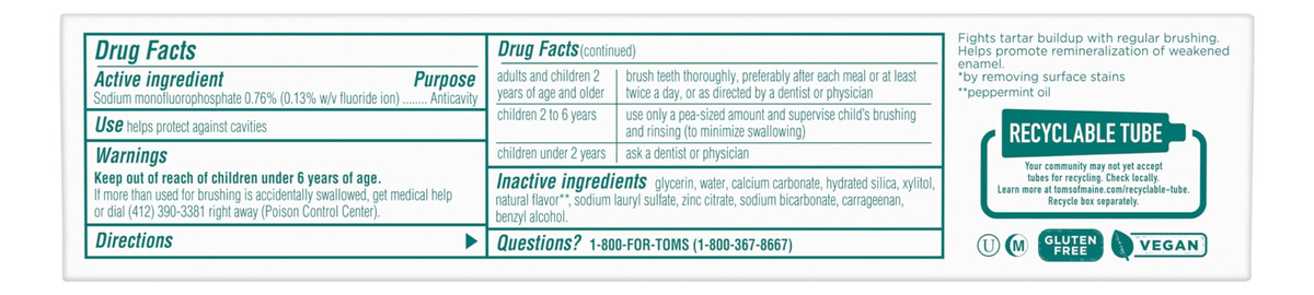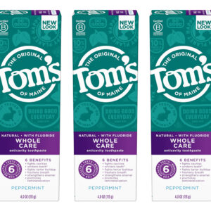 Pasta de dente natural Tom's of Maine Whole Care com flúor e hortelã, 4 onças. Pacote com 3 (a embalagem pode variar) — O que você receberá: três tubos de 4 onças de creme dental Tom's of Maine Whole Care com sabor de hortelã — UMA PASTA DE DENTE, SEIS BENEFÍCIOS: A pasta de dente com flúor combate cáries, fortalece o esmalte e promove a remineralização – CUIDADOS COM TODA A BOCA: Também clareia os dentes, evita o acúmulo de tártaro e refresca o hálito — TUBO RECICLÁVEL: procure a bandeira azul de reciclagem, esprema o máximo de pasta de dente que puder, recoloque a tampa e recicle — CUIDE-SE NATURALMENTE: Não contém adoçantes, conservantes, cores ou sabores artificiais e não é testado em animais