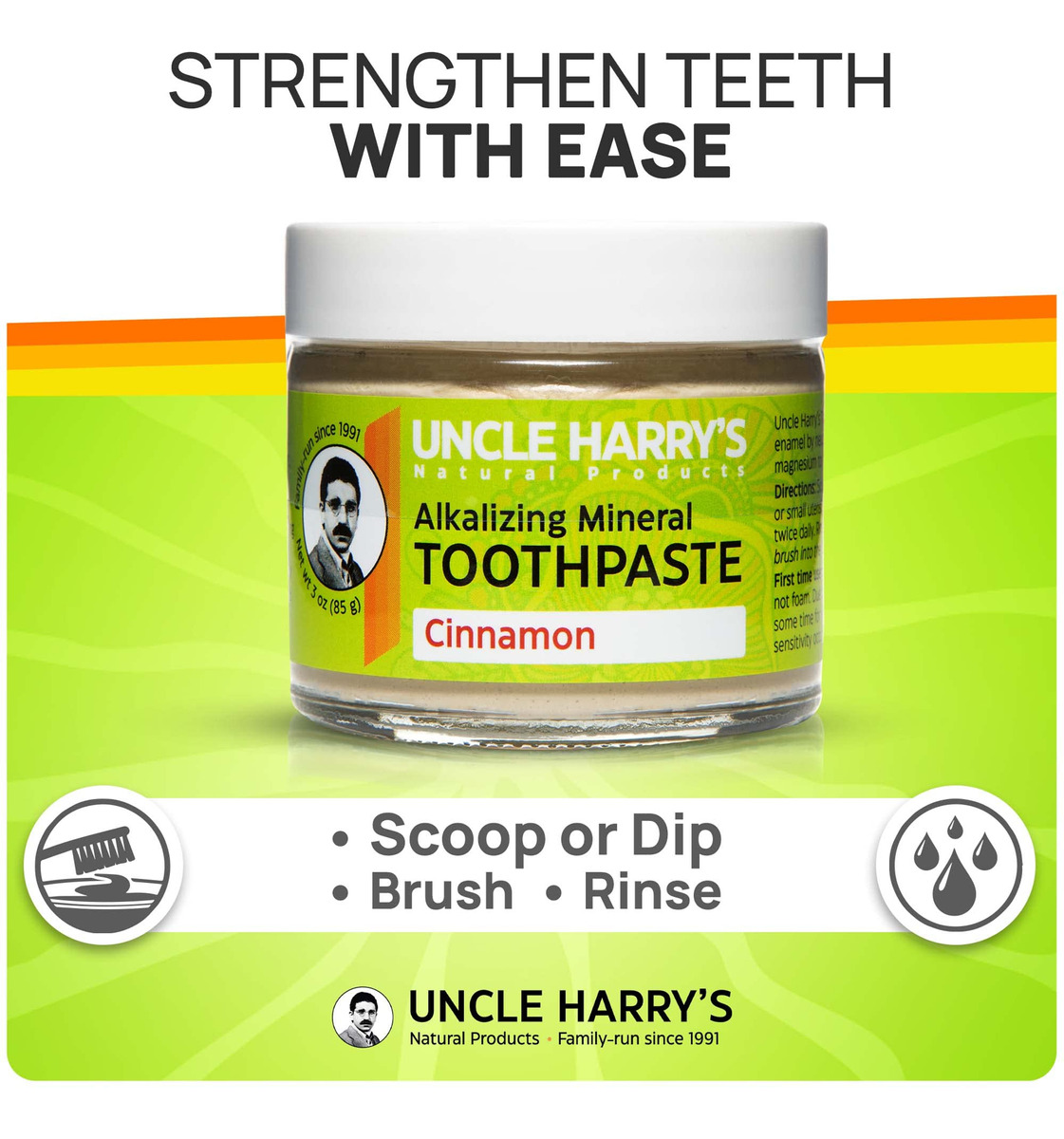 É um creme dental atóxico, livre de conservantes, agentes espumantes sintéticos, abrasivos e glicerina. Os minerais iônicos deste creme dental fornecem quantidades significativas de cálcio e magnésio para dentes saudáveis. – FRESH BREATH Um creme dental totalmente natural que elimina o mau hálito com canela quente e refresca a boca com argilas minerais, sal marinho e essências vegetais puras durante todo o dia. Os produtos de pasta de dente natural Uncle Harry's vêm embalados em um frasco de vidro ecológico, sem desperdício, rotulado à mão. – FORTALEÇA OS DENTES Salve seus dentes e gengivas com a fórmula de creme dental remineralizante do tio Harry. Ele incentiva um esmalte dentário mais saudável ao nutrir os dentes com cálcio, magnésio e fósforo. Também ajuda a manter um pH naturalmente alcalino que é melhor para a saúde bucal e a higiene dental. – CLAREAMENTO NATURAL DOS DENTES Abandone as tiras de clareamento e evite o aumento da sensibilidade dentária. Nossa fórmula de clareamento de creme dental natural ajuda você a se sentir confiante de que está polindo e aperfeiçoando seus dentes sem produtos químicos agressivos. – INGREDIENTES SUSTENTÁVEIS DE PASTA DE DENTE A pasta de dente natural Uncle Harry contém apenas ingredientes naturais e minimamente processados para sua família. Óleos essenciais de argila bentonita, carbonato de cálcio, prata coloidal, sal marinho, semente de mostarda, eucalipto, cravo, gaultéria e orégano. – LIMPOS E DE QUALIDADE Os remédios bucais da Uncle Harry são orgulhosamente isentos de SLS, glúten, glicerina, flúor e veganos para atender até mesmo às necessidades dentárias mais sensíveis e conscientes. Nossos produtos de pasta de dente 100% natural também são feitos sem conservantes sintéticos, como agentes espumantes, cores, sabores artificiais ou bicarbonato de sódio.