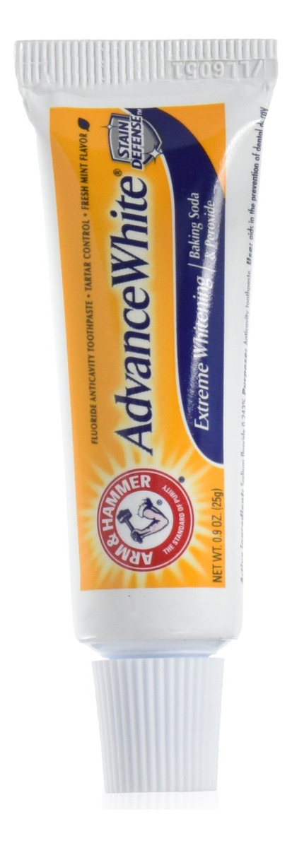 Tubo de pasta de dente para viagem de 0,9 onças. Bicarbonato de sódio e peróxido. Creme dental anticárie com flúor. Controle de tártaro. – Pasta de dentes branca Arm & Hammer Advance. 0,9 onças – 3 tubos