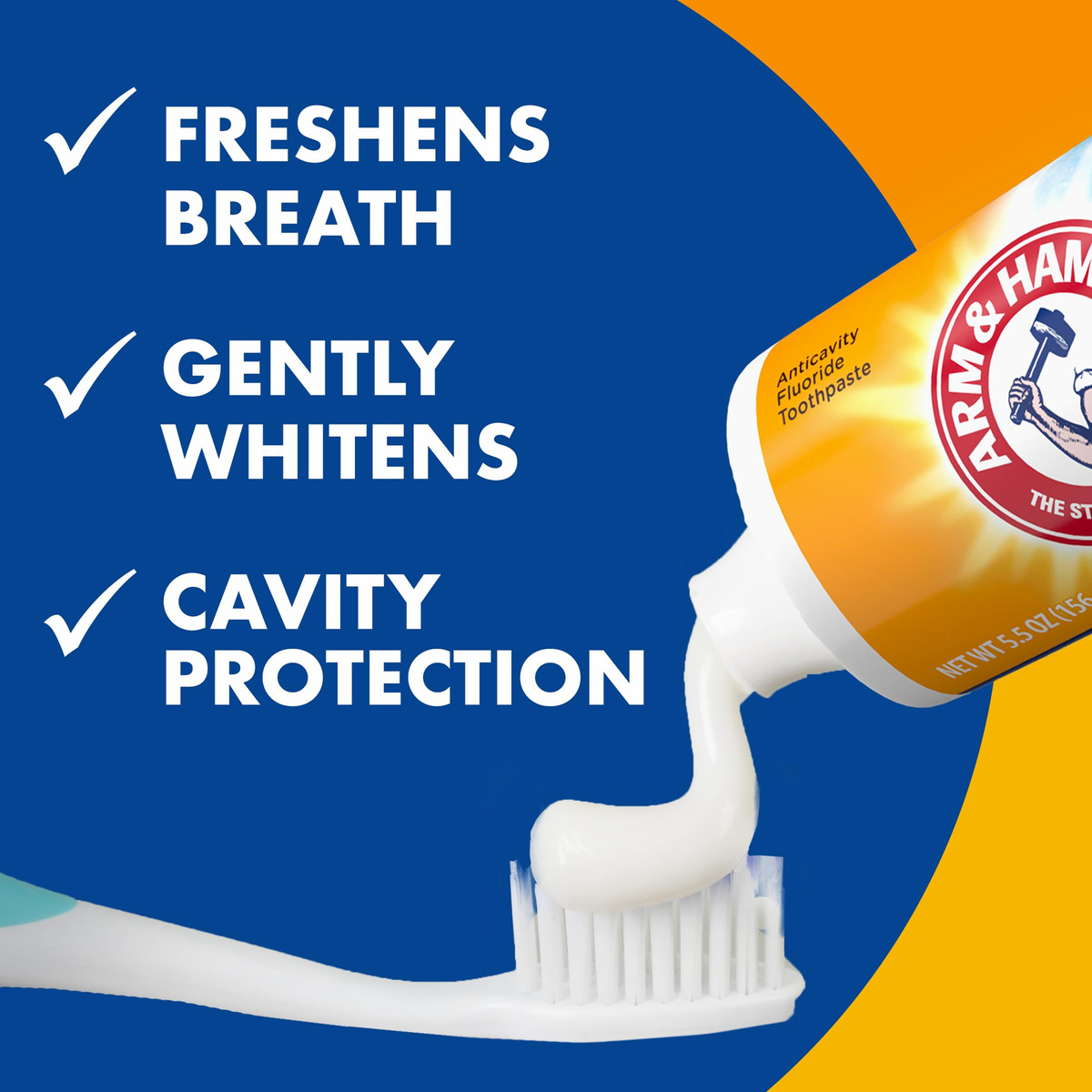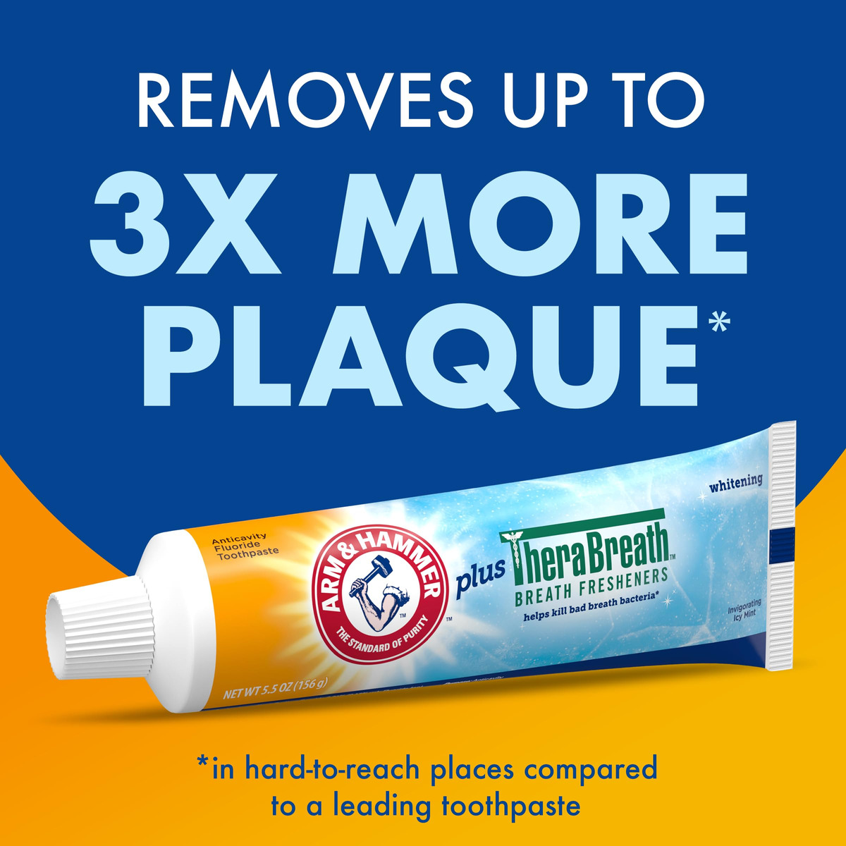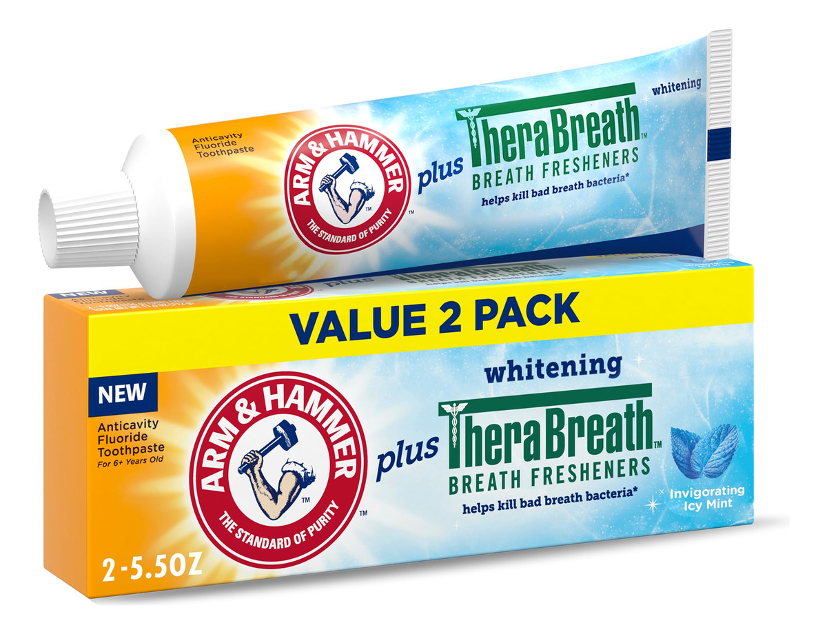 Pasta de dente ARM & HAMMER mais purificadores de hálito TheraBreath, revigorante sabor de menta gelada, creme dental branqueador com flúor anticavitário para mau hálito, 5,5 onças (pacote com 2) — Inclui dois tubos de pasta de dente ARM & HAMMER, além de purificadores de hálito TheraBreath, sabor revigorante de menta gelada — Desfrute de um hálito fresco duradouro com este creme dental branqueador que limpa profundamente dentes e gengivas, combate a placa bacteriana e refresca o mau hálito com os purificadores de hálito TheraBreath — Alimentado naturalmente pelo bicarbonato de sódio ARM & HAMMER, este creme dental branqueador de dentes é menos abrasivo do que cremes dentais regulares (2) e remove até 3 vezes mais placa bacteriana (3) – Com os purificadores de hálito TheraBreath, esse creme dental ajuda a matar bactérias do mau hálito (1) e um sabor revigorante de menta gelada para um frescor duradouro – Escove com este creme dental branqueador para o mau hálito duas vezes ao dia como parte de sua rotina de higiene bucal