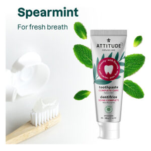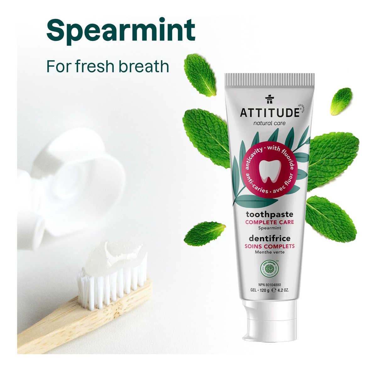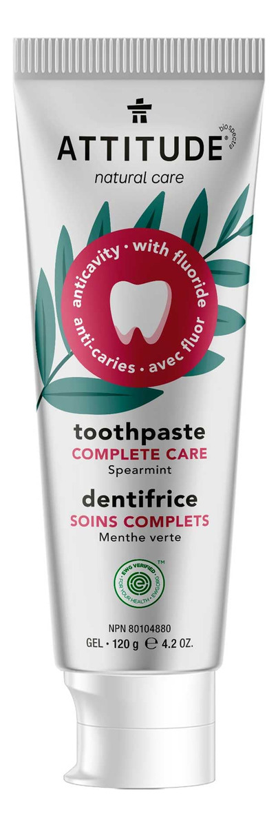 Creme dental ATTITUDE com flúor, previne cáries e cáries dentárias, vegano, sem crueldade e sem açúcar, cuidado completo, hortelã, 4,2 onças — Creme dental vegetal VERDADEIRAMENTE EFICAZ: contém fluoreto de sódio, que ajuda a proteger os dentes contra cáries e erosão — PASTA DE DENTES FEITA COM INGREDIENTES ATENCIOSOS: Feita com ingredientes vegetais e minerais, como folhas de chá verde, que têm propriedades antioxidantes e ajudam a manter uma boa saúde bucal e dental e folhas de mamão, que contêm papaína, e combinada com a escovação, essa pasta de dente contribui para reduzir a placa bacteriana – CREME DENTAL DE CUIDADO COMPLETO: protege e clareia os dentes enquanto ajuda com o mau hálito – PASTA DE DENTE SUSTENTÁVEL: Este produto é vegano, o que significa que não contém ingredientes de origem animal e é livre de crueldade. A fórmula também é biodegradável – PASTA DE DENTES VERIFICADA PELO EWG: esta pasta de dente não contém ingredientes preocupantes, de acordo com os cientistas do Environmental Working Group