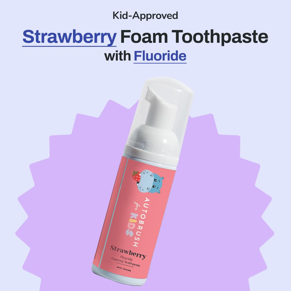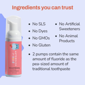 O creme dental autobrush Foam é elaborado com os melhores ingredientes para um cuidado bucal ideal. Experimente a alegria de escovar com nossa fórmula de espuma suave, projetada para cativar crianças e adultos. A poderosa textura de espuma atinge facilmente os pontos difíceis entre os dentes e ao longo da linha da gengiva. Nosso creme dental de espuma é resistente à placa bacteriana, mas suave ao esmalte, garantindo a limpeza dos dentes, língua, bochechas e gengivas com cada escova. Sua consistência leve e espumosa o torna ideal para pessoas com sensibilidades sensoriais, além de funcionar como enxaguante bucal, proporcionando uma experiência abrangente de higiene bucal. Escolha entre nossa variante sem flúor com Nano-HAP ou nossa opção de creme dental com espuma de flúor que atende a uma ampla gama de preferências. O creme dental Nano-HAP com escova automática não é apenas eficaz para adultos, mas também ideal para creme dental para treinamento ou creme dental para crianças pequenas, pois é seguro engolir em pequenas quantidades. Esse aspecto adicional de segurança torna a escovação uma experiência sem preocupações para pais e responsáveis. Combine nosso creme dental de espuma com qualquer modelo de escova automática para obter a melhor experiência de escovação que promove hábitos saudáveis de higiene bucal desde tenra idade. – CREME DENTAL PARA TREINAMENTO PARA CRIANÇAS: Oferecemos creme dental em espuma em variedades sem flúor e sem flúor para que você possa escolher a mais adequada para sua família. Nossa opção sem flúor é uma ótima pasta de dente para bebês e funciona perfeitamente para crianças que ainda estão aprendendo a cuspir a pasta de dente na pia. – Combate as cáries: com nossa pasta de dente espumante de morango que vale a pena babar, combate a placa bacteriana em áreas de difícil acesso, como bochechas, debaixo da língua e debaixo da língua. – Funciona com todas as escovas de dente: combina perfeitamente com escovas de dente em forma de U, como a escova automática, mas também pode ser usada com escovas de dentes manuais! – FÁCIL DE APLICAR: as crianças podem aplicar sua pasta de dente de forma independente com nossos frascos de bomba de 50 ml fáceis de usar. Cada frasco dura até um mês e é compatível com a TSA! – FUNCIONA COMO ENXAGUANTE BUCAL: Esta espuma pode ser usada sozinha como enxaguatório bucal. Aplique 2 bombas diretamente na boca e agite a fórmula nas bochechas por 30 segundos. Cuspa, enxágue com água e pronto!
