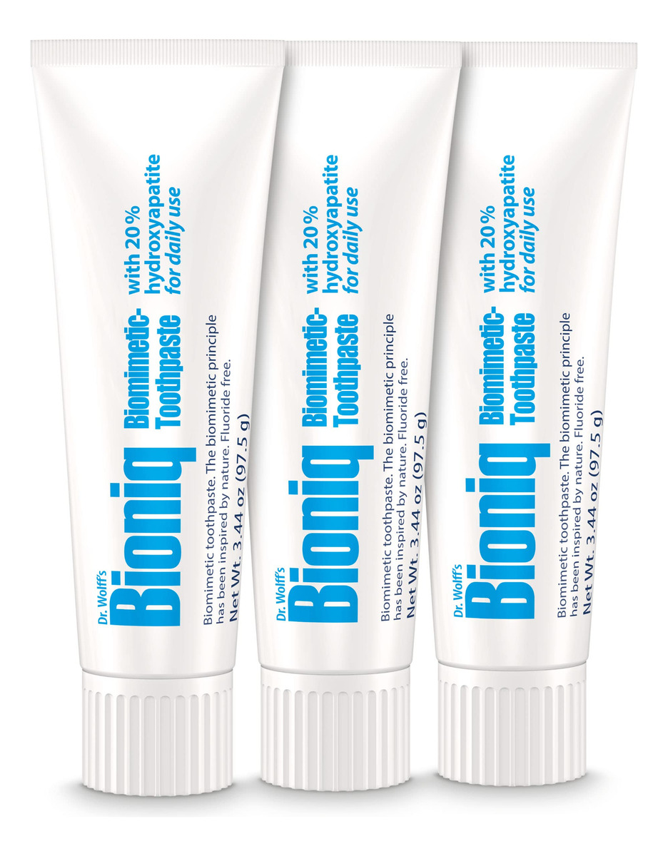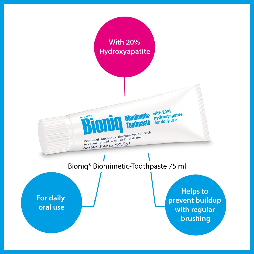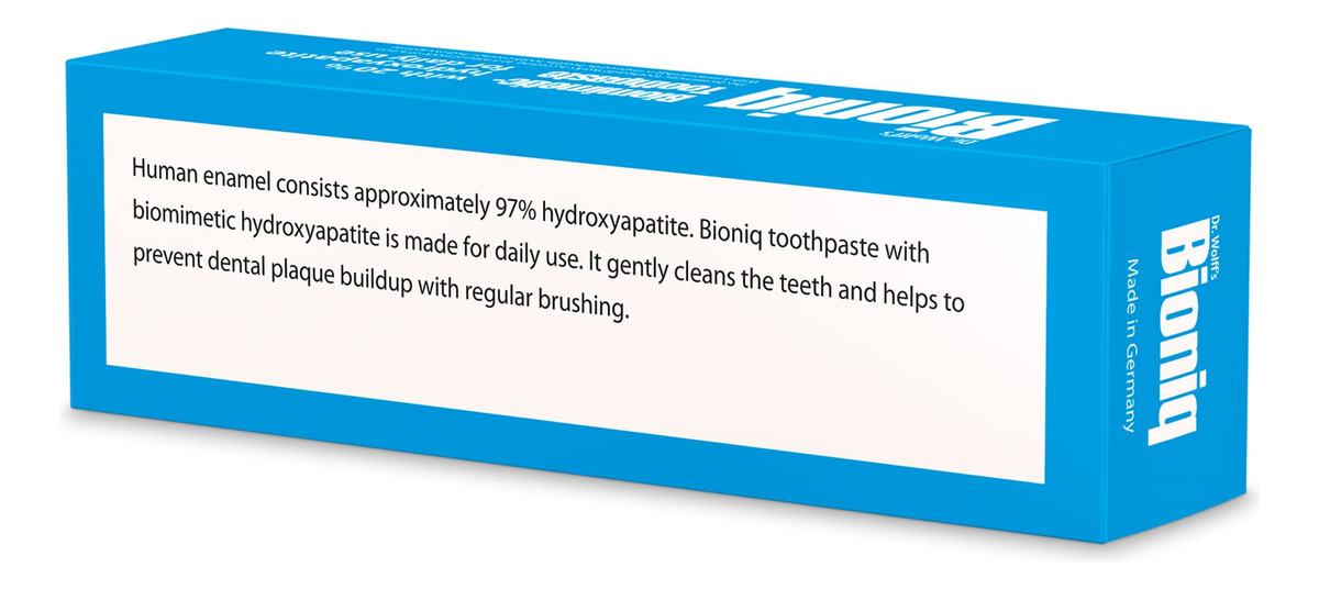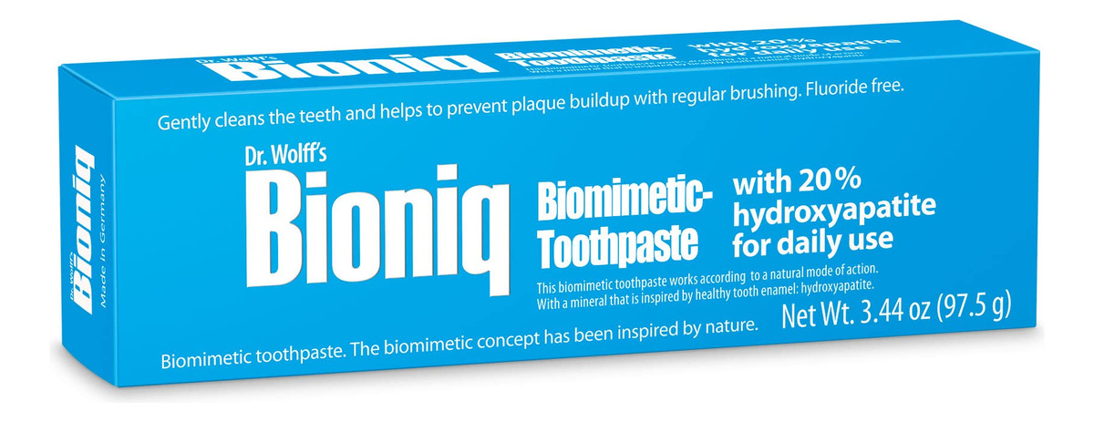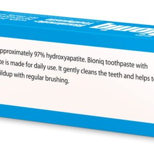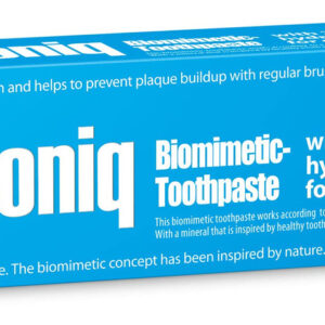 O creme dental Bioniq é feito com 20% de hidroxiapatita, a substância da qual os dentes são feitos. Projetado para imitar a natureza, este creme dental biomimético limpa os dentes para ajudar a prevenir o acúmulo de placa. – BioHap ou hidroxiapatita biomimética: os dentes consistem em aproximadamente 97% de hidroxiapatita, que é uma das substâncias mais duras do corpo humano. Essa substância torna o esmalte dentário duro e resistente, protegendo os dentes de ácidos e bactérias. A hidroxiapatita é essencial para dentes fortes e saudáveis. No entanto, esse mineral se desgasta com o tempo e não pode ser restaurado pelo corpo humano. – Alto desempenho: com 20% de BioHap ou hidroxiapatita biomimética, mais conhecida como esmalte artificial, o Bioniq limpa os dentes e ajuda a prevenir o acúmulo de placa bacteriana com a escovação regular, o que melhora a saúde do esmalte dentário – SEM FLÚOR E SLS: O Bioniq limpa suavemente os dentes sem flúor e sódio Sulfato de Ilo – Bioniq: A biônica é, por definição, a aplicação de métodos e sistemas biológicos encontrados na natureza. Nós da Bioniq aproveitamos esse fenômeno em aplicações técnicas, como produtos de higiene bucal – PARA MAIORES DE 12 ANOS