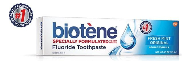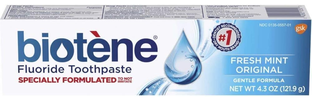 Creme dental Biotene para boca seca, original de menta fresca, caixa de 4,5 onças (pacote com 4) — Pasta de dente com flúor de fórmula suave Biotene Fresh Mint Original, 4,3 onças (pacote econômico com 4)
