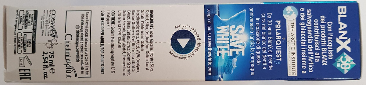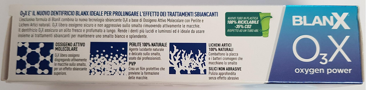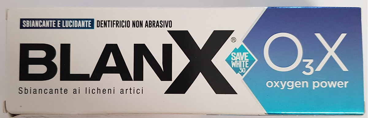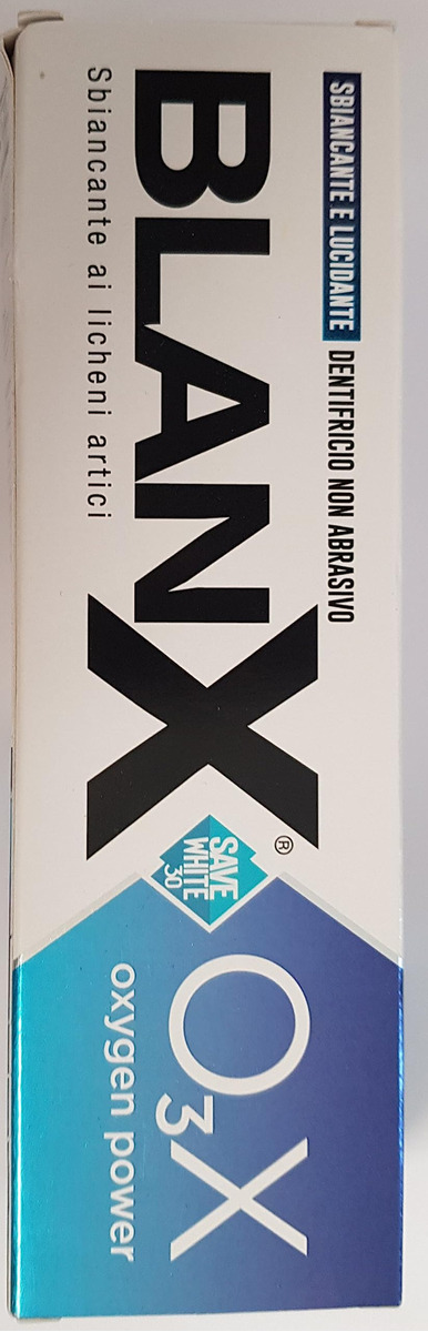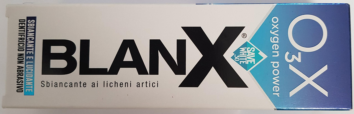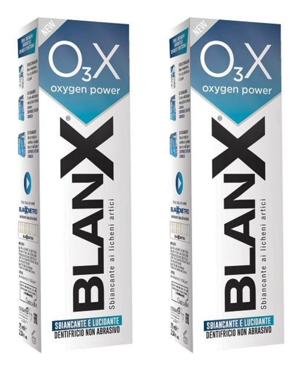 A fórmula exclusiva BLanX combina a nova tecnologia de clareamento O3X baseada em oxigênio ativo com perlita e líquenes árticos naturais. O O3X fornece oxigênio seguro e não agressivo ao esmalte, removendo ativamente as manchas. O creme dental O3X torna os dentes mais brilhantes e é ideal para uso em conjunto com tratamentos de clareamento para manter o esmalte branco e brilhante. – ideal para prolongar o efeito dos tratamentos clareadores – não é abrasivo e é perfeito para usar antes e depois dos tratamentos de clareamento para manter o esmalte dentário sempre branco, brilhante e polido – perlita 100% natural e líquen ártico – efeito de polimento – garante uma frescura duradoura respiração