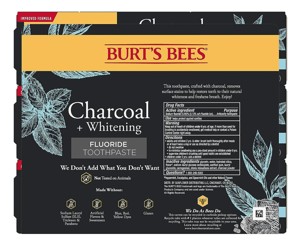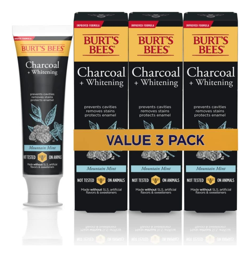 Pasta de dente Burt's Bees, sabor natural, pasta de dente com flúor, hortelã da montanha, 3 x 4,7 onças — Contém carvão vegetal para remover manchas superficiais e ajudar a restaurar a brancura natural dos dentes — Feita para deixar seu hálito fresco e seu esmalte forte, para um lindo sorriso e uma boca saudável — Feito sem: laurilsulfato de sódio (SLS), triclosan e parabenos, sabores artificiais e uma boca saudável Adoçantes, conservantes e corantes azuis, vermelhos e amarelos, microesferas de plástico – creme dental com sabor de óleo essencial com flúor
