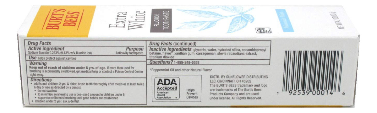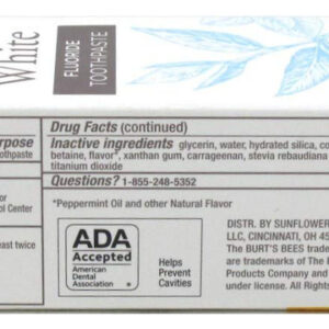 Remove manchas. Protege o esmalte. Evita cáries. ADA aceita. Não testado em animais. Feito sem SLS, sabores artificiais e adoçantes. Sem parabenos. Sem corantes. Sem triclosan. O creme dental Burt's Bees Extra White foi criado para deixar seu hálito fresco e sua boca limpa. Experimente o refresco do creme dental Zen Peppermint, que o deixará limpo e fresco! Não testado em animais. As caixas são 100% recicláveis. Feito sem: laurilsulfato de sódio (SLS), triclosan e parabenos, sabores artificiais e adoçantes, conservantes e corantes azuis, vermelhos e amarelos, microesferas de plástico. Criado para ajudar a remover manchas superficiais e ajudar você a conseguir um lindo sorriso. Aceito pela ADA. – Fórmula de clareamento natural: esta pasta de dente é formulada com ingredientes naturais, incluindo hortelã da montanha, que ajudam a clarear os dentes e remover manchas sem produtos químicos agressivos. – Proteção contra flúor: com adição de flúor, essa pasta de dente fortalece efetivamente o esmalte dos dentes e protege contra cáries, garantindo uma higiene bucal abrangente. – Sabor refrescante de menta da montanha: desfrute do sabor revigorante da hortelã da montanha que deixa sua boca fresca e limpa após cada sutiã sessão de lavagem. – Embalagem ecológica: o produto vem em um pacote de 2, reduzindo o desperdício e tornando-o uma escolha ambientalmente consciente para os consumidores. – Ingredientes de origem sustentável: A Burts Bees está comprometida em usar ingredientes de origem responsável, tornando essa pasta de dente uma opção natural e ecológica para higiene bucal.