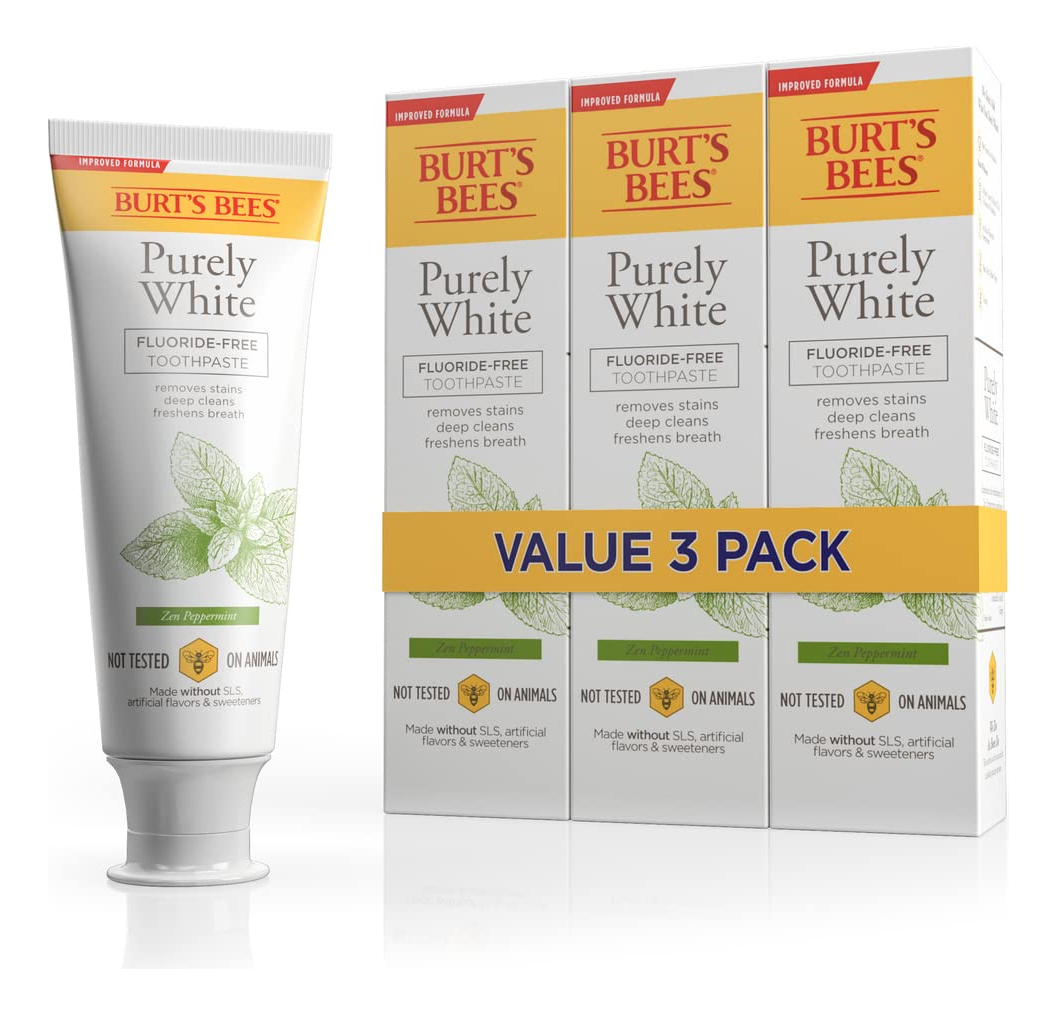 Pasta de dente Burt's Bees, sabor natural, sem flúor, puramente branca, hortelã zen, 4,7 onças, pacote com 3 – Inclui três tubos de 4,7 onças de pasta de dente Burts Bees puramente White Zen sem flúor – Experimente o refresco da pasta de dente Zen Peppermint que o deixará limpo e fresco – Feito sem: laurilsulfato de sódio (SLS), triclosan e parabenos, sabores e adoçantes artificiais, conservantes e corantes azuis, vermelhos e amarelos, microesferas de plástico — Feitas para ajudar a remover manchas superficiais e ajudar você a conseguir um lindo sorriso — Sabor de óleo essencial, flúor creme dental grátis