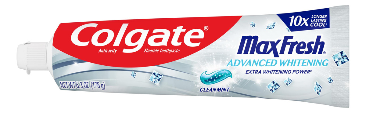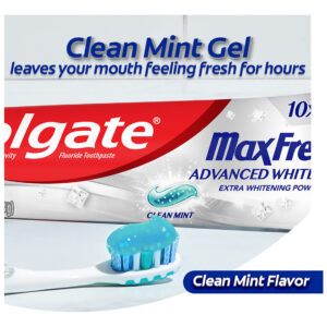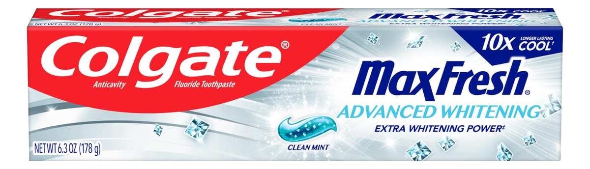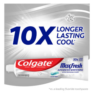 Creme dental Colgate Max Fresh, creme dental branqueador avançado com mini tiras de hálito, pasta de dente limpa de menta para mau hálito, ajuda a combater cáries, clareia os dentes e refresca o hálito, tubo de 6,3 onças – Um tubo de 6,3 onças de creme dental branqueador Colgate Max Fresh Advanced, Clean Mint – Ajuda a clarear os dentes com poder clareador extra (versus o ingrediente clareador do Colgate Max Fresh com creme dental branqueador) – Colgate Max Fresh a pasta fornece resfriamento 10 vezes mais duradouro do que um dos principais cremes dentais com flúor – O creme dental refrescante com menta refresca o hálito por horas – A fórmula de creme dental com flúor ajuda a combater as cáries ao escovar