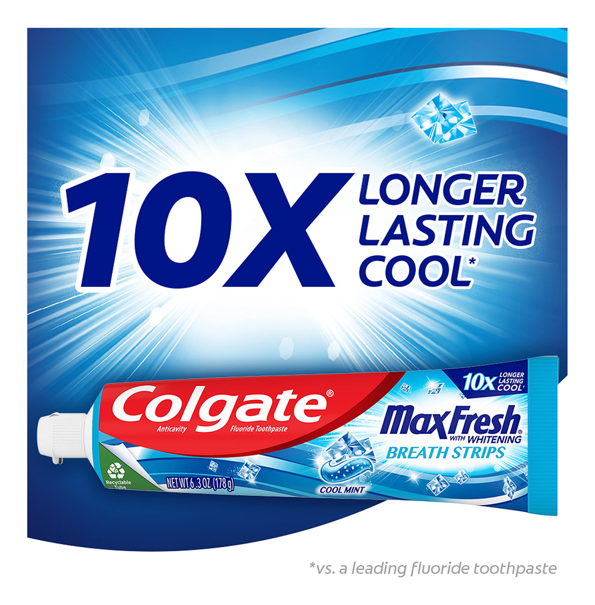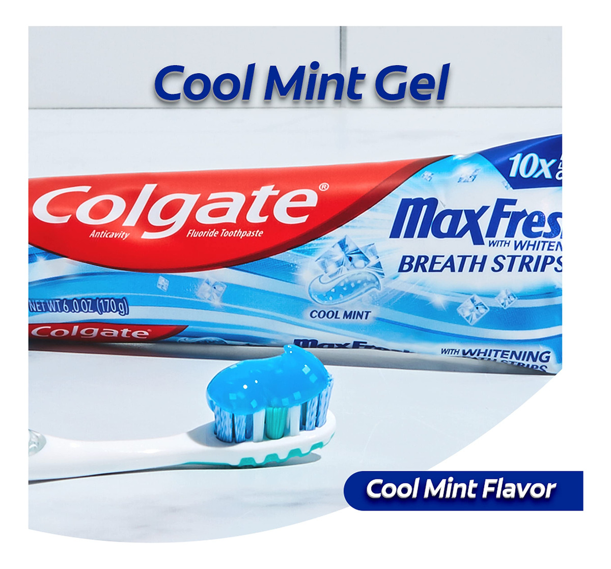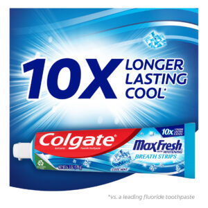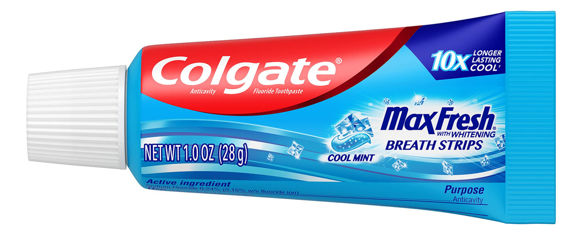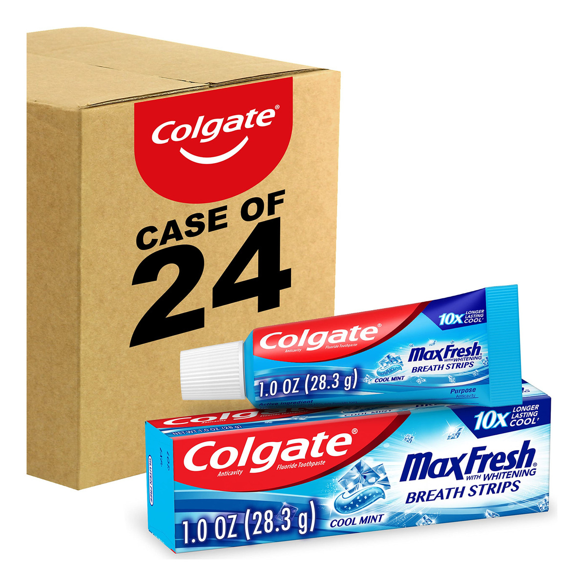 Pasta de dente Colgate Max Fresh Travel Size com mini tiras de respiração, hortelã fresca — pacote com 24 — Frescura que dura horas — Embalada com centenas de minitiras de respiração — Creme dental com flúor para combater cáries — Clareia os dentes removendo manchas superficiais — Sem açúcar, sem glúten — Sabor fresco de menta
