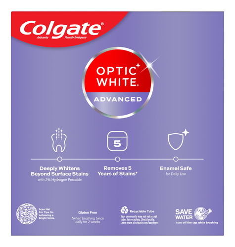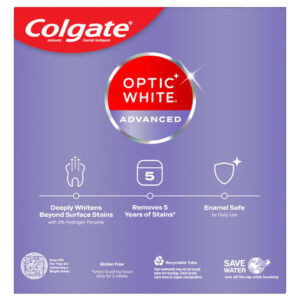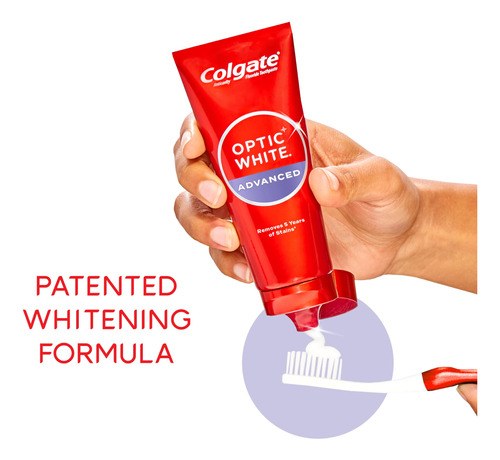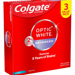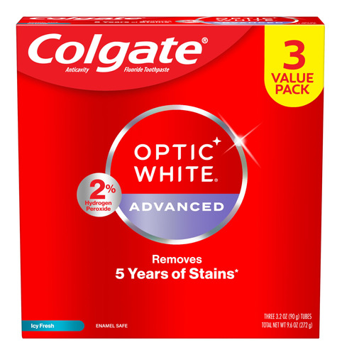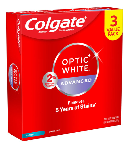 Pacote de creme dental Colgate Optic White Advanced com peróxido de hidrogênio, creme dental clareador dental, fórmula de peróxido de hidrogênio seguro para esmalte, ajuda a remover manchas de chá, café e vinho, pacote com 3 (3,2 onças) — Inclui três (3) tubos de 3,2 onças de creme dental Colgate Optic White Advanced Icy Fresh Hydrogen, creme dental clareador dental — Remova 5 anos de manchas* com o Colgate Optic White Advanced Teeth Whitening Pasta (*ao escovar duas vezes ao dia por 2 semanas) – Esta pasta de dente com 2% de peróxido de hidrogênio usa uma fórmula clareadora patenteada que é segura para o esmalte para uso diário usa e vem em um sabor fresco e fresco – Remove eficazmente as manchas de chá, café e vinho** com a fórmula de 2% de peróxido de hidrogênio (**conforme mostrado em um estudo de laboratório) – O creme dental Colgate Optic White Advanced Hydrogen Peroxido é um creme dental anticavitário feito com flúor para ajudar a combater cáries