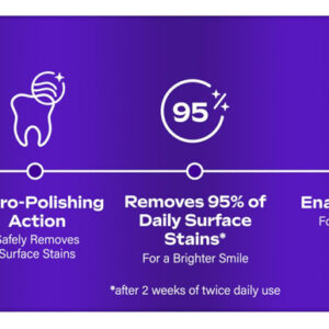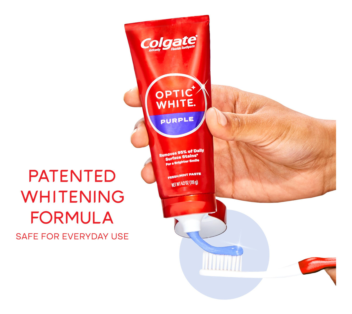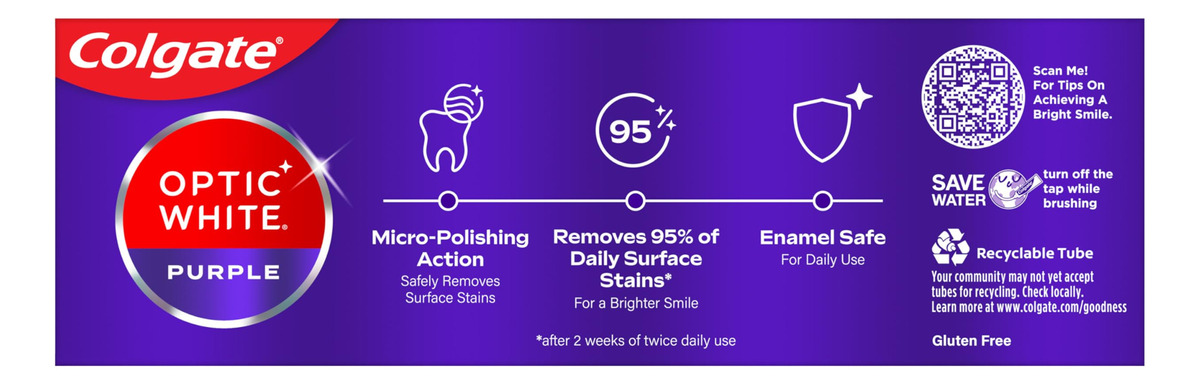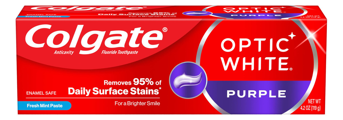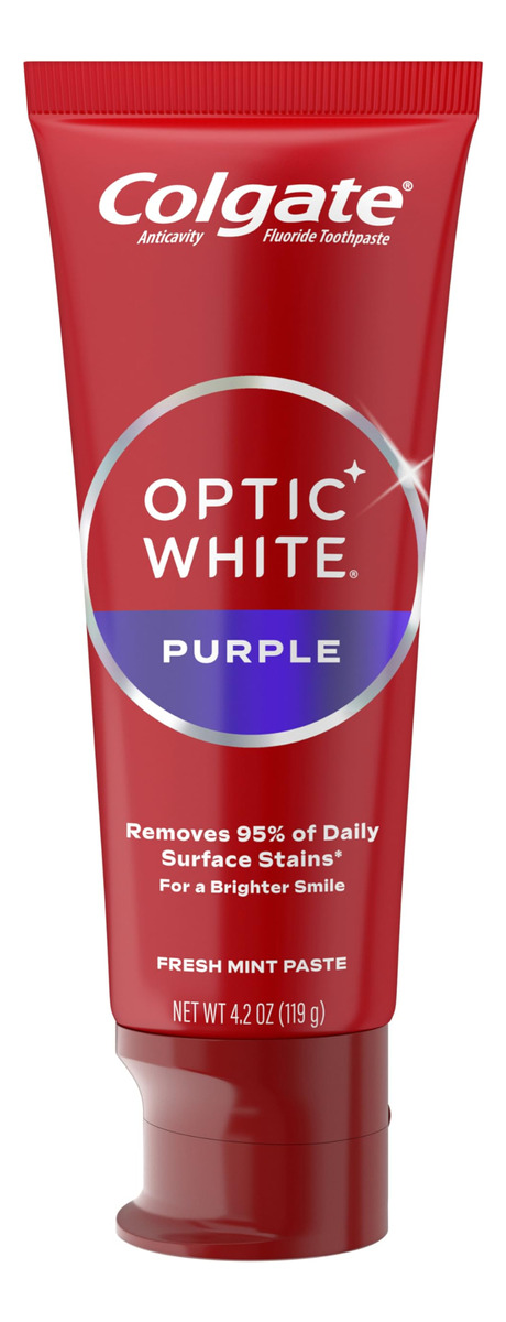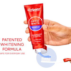 Creme dental branco roxo Colgate Optic para clareamento de dentes, creme dental clareador de dentes com flúor, ajuda a remover manchas superficiais e polir os dentes, seguro para uso diário, pasta de menta, 4,2 onças – Inclui um (1) tubo de 4,2 onças de creme dental roxo branco Colgate Optic para clareamento de dentes, creme dental com flúor – Este creme dental roxo remove 95% das manchas superficiais diárias para um sorriso mais brilhante* (*( após 2 semanas de uso duas vezes ao dia) – O sabor refrescante da pasta de menta ajuda a refrescar o hálito toda vez que você escova com esta pasta de dente de menta – Remove 5 vezes mais manchas superficiais com ação de micropolimento** (**versus creme dental comum, não branqueador após 2 semanas de uso contínuo) – Este creme dental vegano é sem glúten, sem açúcar e seguro para o esmalte para uso diário – O creme dental Colgate Optic White Purple é um creme dental anticavity feito com uma fórmula à base de flúor – Para um clareamento que funcione, escolha o creme dental Colgate Optic White Purple