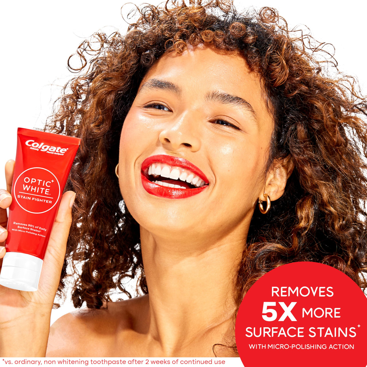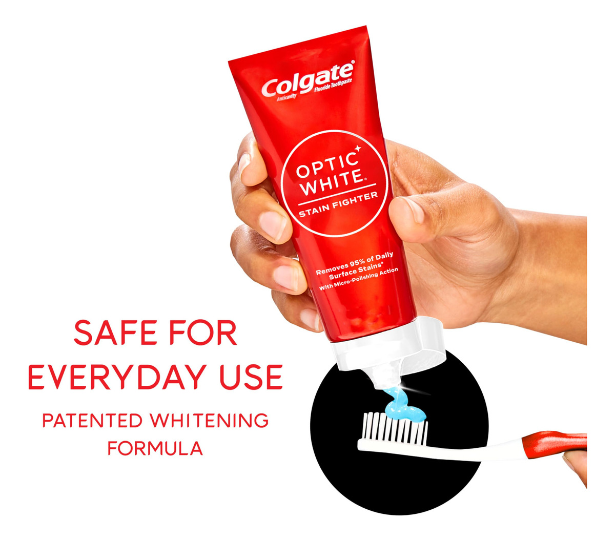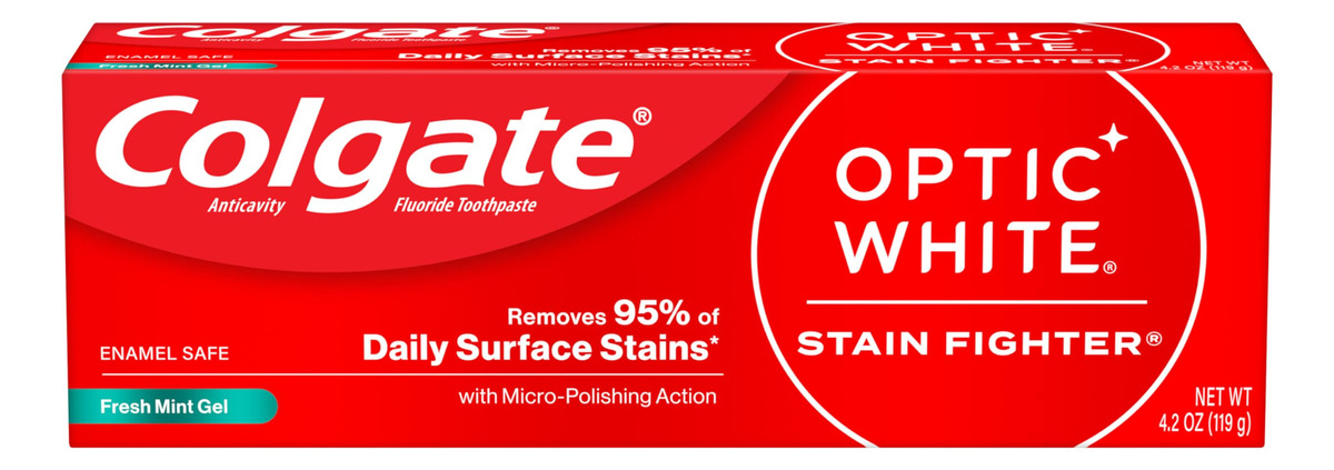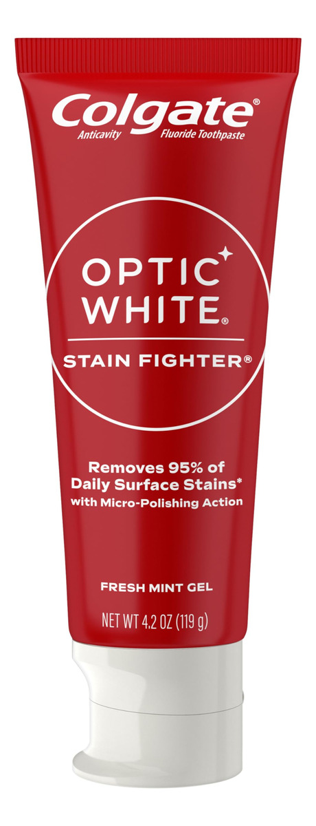 Creme dental branqueador de dentes Colgate Optic White Stain Fighter, creme dental anticavity com flúor para clarear os dentes, ajuda a remover manchas superficiais diárias, hortelã fresca, 4,2 onças – um tubo de 4,2 onças de creme dental branqueador Colgate Optic White Stain Fighter, Fresh Mint – Optic White Stain Fighter é um creme dental que combate manchas e ajuda a evitar a formação de novas manchas – Remove 5 vezes mais superfícies manchas* com ação de micropolimento (*versus creme dental não branqueador comum, após 2 semanas de uso contínuo) – Este gel de creme dental clareador contém clinicamente tecnologia comprovada para remover manchas superficiais com segurança e é segura para uso diário – o creme dental em gel Fresh Mint refresca o hálito e deixa sua boca limpa