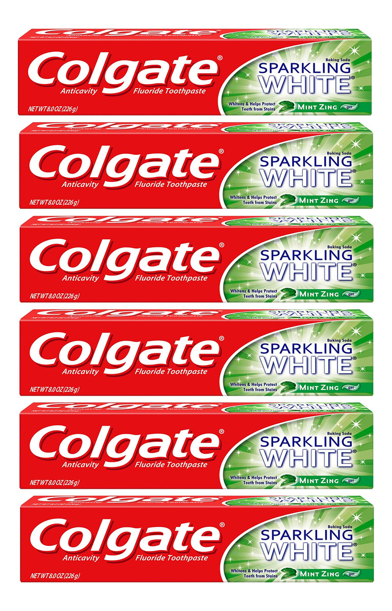 Creme dental branqueador Colgate Sparkling White, hortelã — 8 onças (pacote com 6) — Ajuda a remover manchas para clarear os dentes — Clareia os dentes e combate as cáries — Ajuda a prevenir o acúmulo futuro de manchas nos dentes — Uma fusão de óleos essenciais naturais de hortelã e hortelã — Combate as cáries