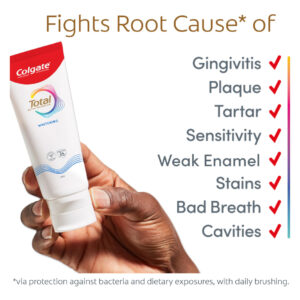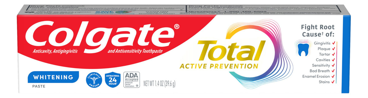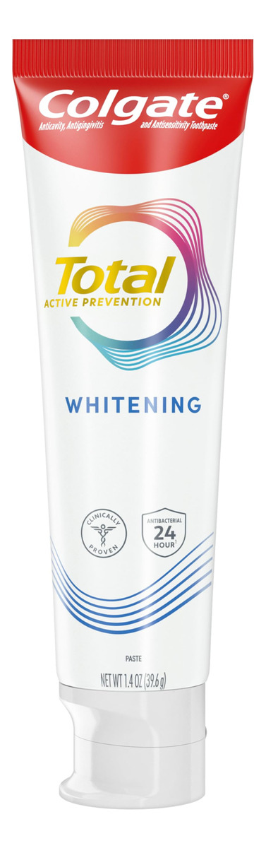 Pasta de dente Colgate Total Whitening Travel, pasta de dente de menta para viagens, pasta de dente tamanho de mão, tubo de 1,4 onças — Inclui um (1) tubo de viagem de 1,4 onças de creme dental clareador de viagens Colgate Total Active Prevention, hortelã — Combate bactérias, a causa raiz de problemas de saúde bucal, como gengivite, placa bacteriana, tártaro, sensibilidade, mau hálito e cáries — Este creme dental branqueador com flúor para viagens usa clinicamente um fórmula comprovada para ajudar a prevenir problemas de saúde bucal antes que eles comecem* – A fórmula refrescante de creme dental com menta ajuda a refrescar o hálito e remove manchas superficiais – Este creme dental anticavidade oferece 24 horas de proteção antibacteriana de longa duração ao escovar duas vezes ao dia com 4 semanas de uso contínuo