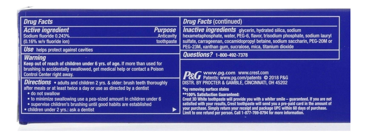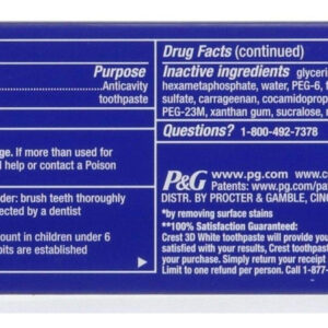Ilumine seu sorriso com o creme dental branqueador avançado Crest 3D White. Ele remove até 100% das manchas superficiais e possui tecnologia de prevenção de manchas 24 horas* *manchas superficiais com escovação duas vezes ao dia. O creme dental branqueador avançado Crest 3D White apresenta ingredientes clareadores clinicamente comprovados para revelar dentes mais brancos em 3 dias. Remove até 100% de manchas superficiais. Dentes brancos em 3 dias. 24 horas. Tecnologia de prevenção de manchas com escovação duas vezes ao dia – Clareamento eficaz: o creme dental branqueador avançado com flúor Crest 3D White fornece um efeito clareador profundo e duradouro. – Ingredientes seguros: contém ingredientes como betaína, cocamidopropil, glicerina, mica e sílica, que são suaves para dentes e gengivas. – Sabor semelhante ao enxaguante bucal: A pasta de dente tem um sabor refrescante e mentolado que você vai adorar. – Força para adultos: formulada para adultos e contém flúor para fortalecer os dentes. – Tubo Embalagem: Vem em um tubo conveniente que é fácil de usar e dispensar.