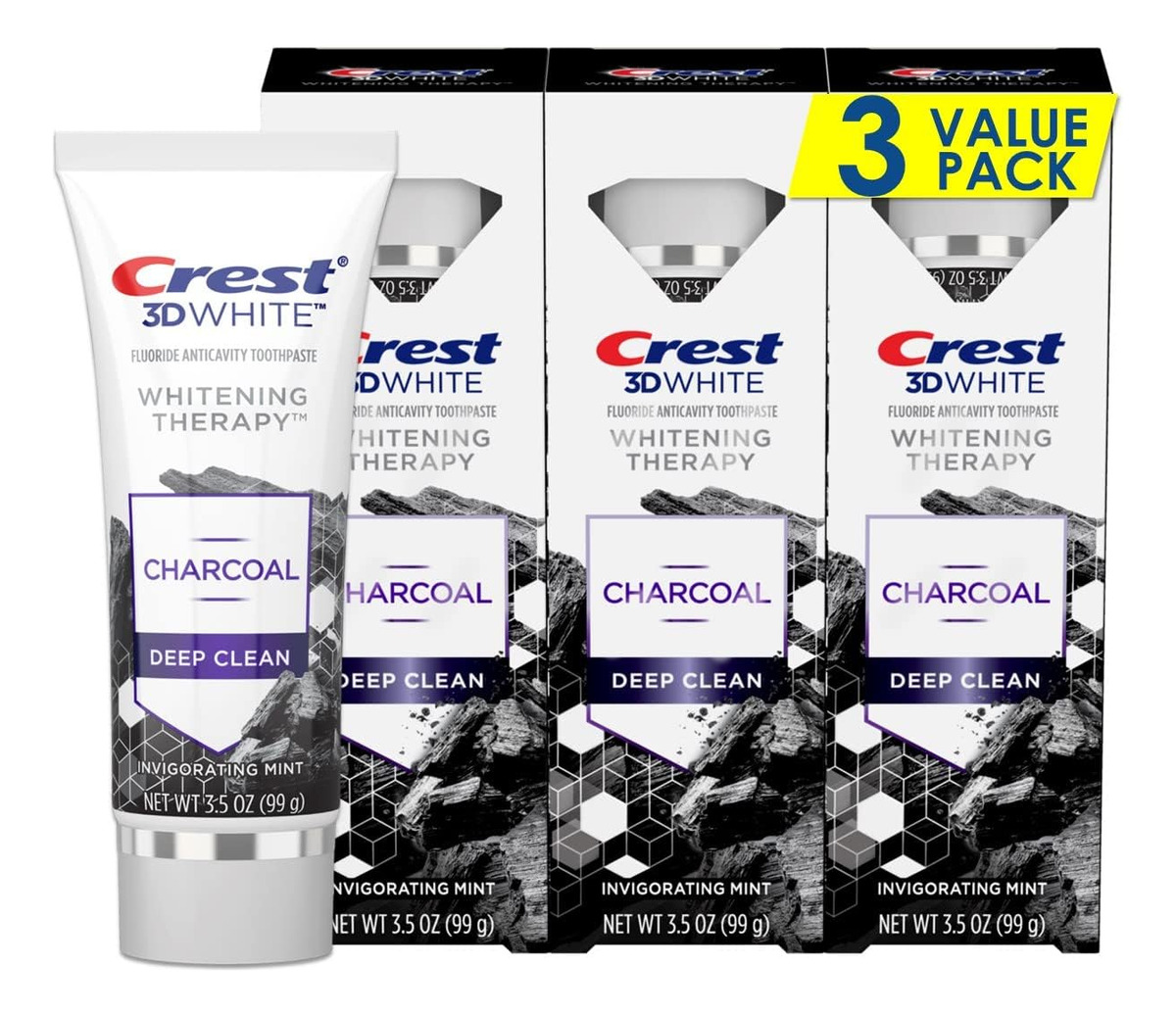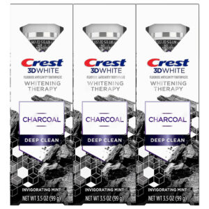 Creme dental de flúor Crest 3D White Whitening Therapy Charcoal Deep Clean, hortelã revigorante, 3,5 onças, pacote com 3 – Você receberá (3) tubos de 3,5 onças de creme dental Crest 3D White Whitening Therapy Charcoal – Creme dental clareador suave – Pasta de dente listrada em preto e branco remineralizante que fortalece o esmalte dentário enfraquecido – Contém flúor para combater cáries – Sensação refrescante duradoura com sabor revigorante de menta