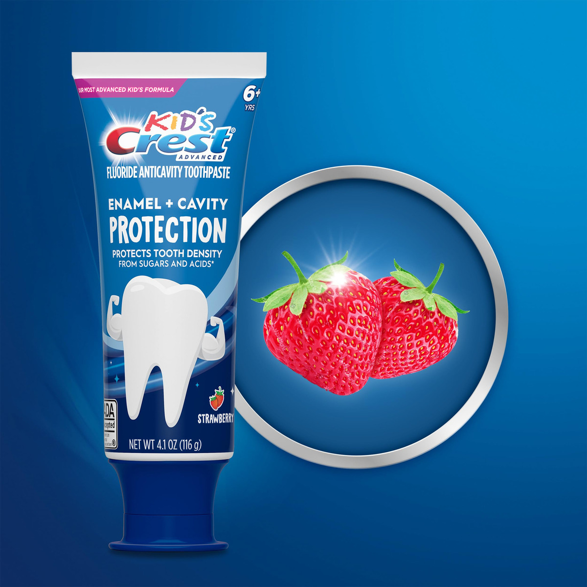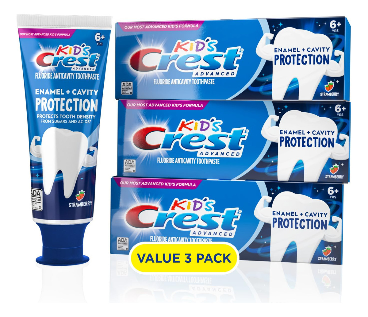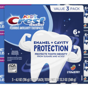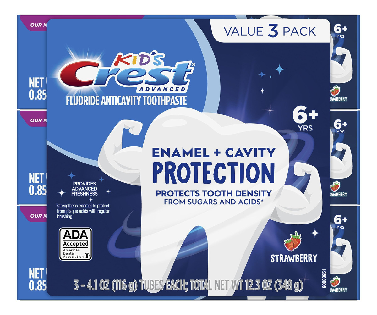 Creme dental Crest Kids Enamel + Cavity Protection, 4,1 onças (pacote com 3) — Você receberá (3) tubos de 4,1 onças de creme dental Crest Kids Enamel + Cavity Protection, sabor morango — Nossa melhor proteção para crianças da Kid's Crest, a marca #1 de pasta de dente infantil na América – Reconstrói a densidade dentária para dentes mais fortes**fortalece o esmalte enfraquecido – Ajuda a proteger o esmalte de açúcares e ácidos**fortalece o esmalte esmalte de lentes para proteger dos ácidos da placa com escovação regular – Aceito pela ADA