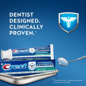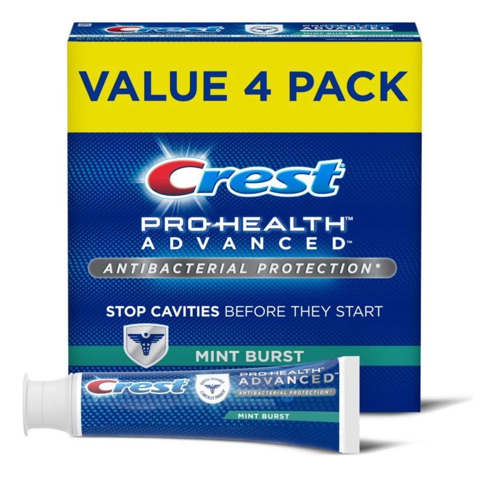 Creme dental de proteção antibacteriana avançada Crest Pro-Health, Mint Burst, 5 onças (pacote com 4) — Você receberá (4) tubos de 5 onças Creme dental de proteção antibacteriana avançada Crest Pro-Health no sabor Mint Burst — Protege contra áreas que os dentistas mais verificam — 8 benefícios para a saúde avançada da boca inteira — Fórmula de limpeza profunda — Oferece proteção dental avançada à placa bacteriana Crest Pro-Health para manter as gengivas saudáveis