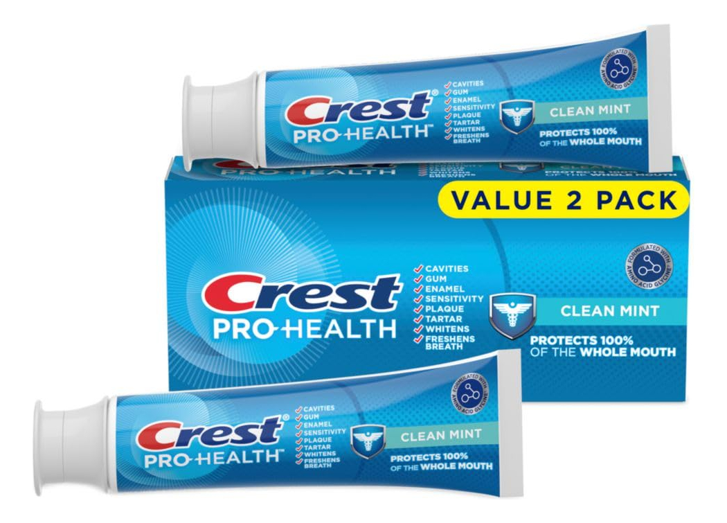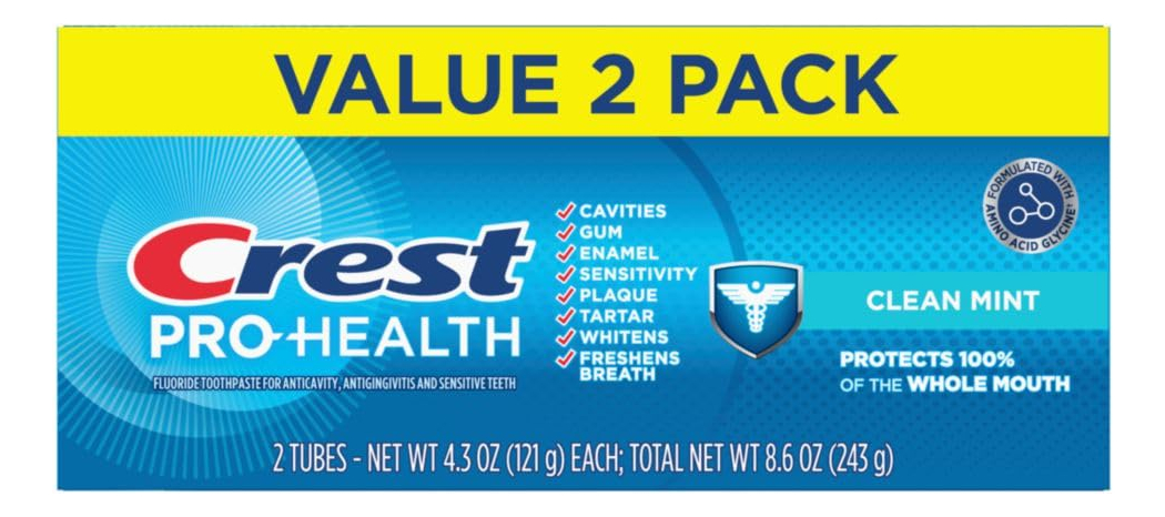 Pacote duplo de pasta de dente Crest Pro-Health Clean Mint (4,3 onças) — Fórmula suave e espumosa com um sabor ousado e revigorante de menta fresca — Protege 100% da boca inteira — 8 benefícios avançados em 1 pasta de dente — Contém flúor estanoso para ajudar a combater cáries e proteger contra placa bacteriana, gengivite e sensibilidade dentária — O sabor de menta limpa deixa seu sorriso brilhante e fresco — Dentes mais fortes fortalecendo o esmalte — Estabilizado com Aminoácido glicina para liberar o poder do fluoreto de estanho