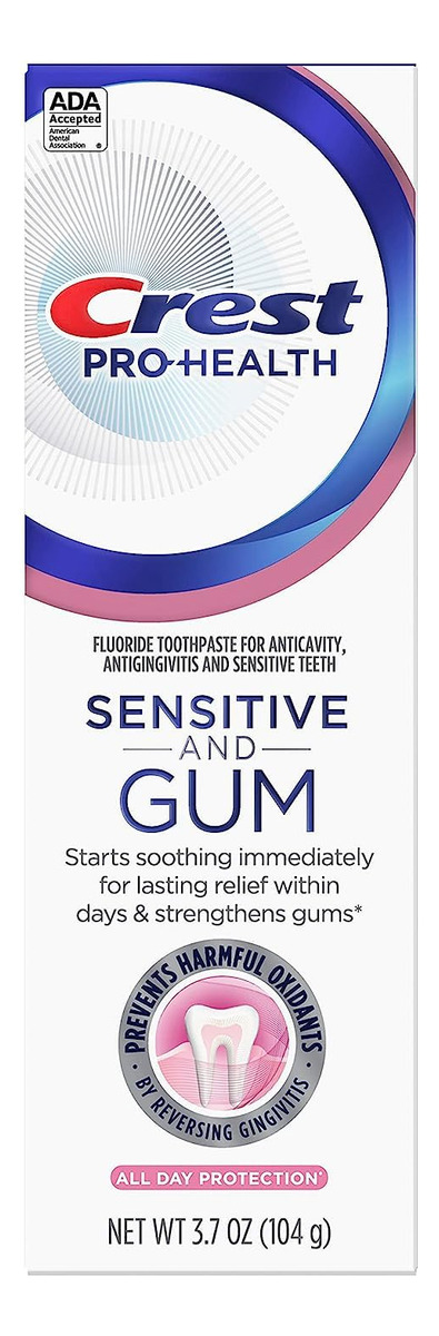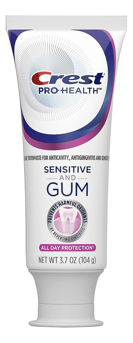 Goma e sensibilidade Crest Pro-Health, creme dental sensível, proteção durante todo o dia, 3,7 onças — Você receberá um tubo de 3,7 onças de chiclete e creme dental sensível Crest Pro-Health — Começa a suavizar imediatamente e cria um escudo de proteção contra alimentos/bebidas para alívio duradouro da sensibilidade em poucos dias* * Alívio da sensibilidade com escovação duas vezes ao dia – Comprovado clinicamente que fortalece as gengivas para proteger os dentes Ajuda a reverter a gengivite. – Evita que oxidantes nocivos causem estresse nas gengivas – Oferece proteção superior com o poder do flúor estanoso