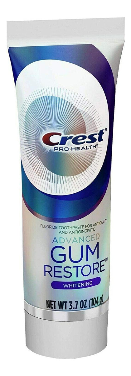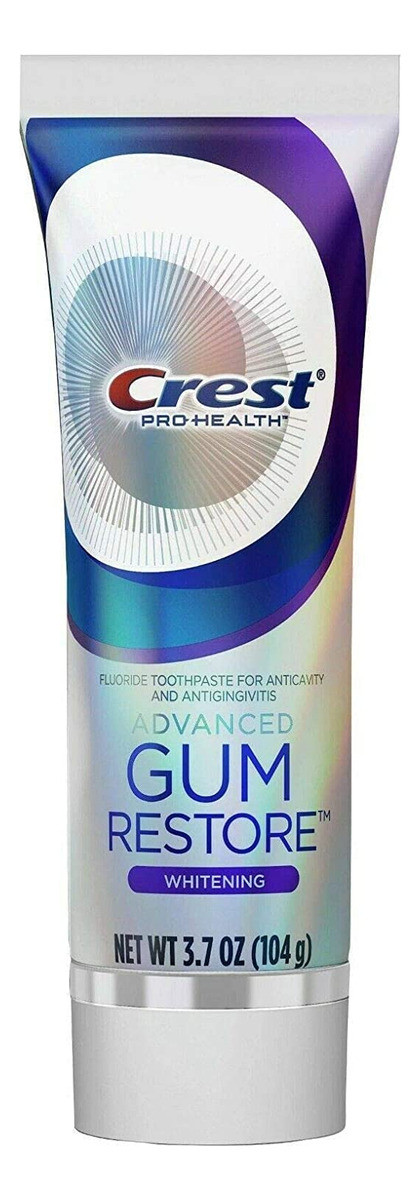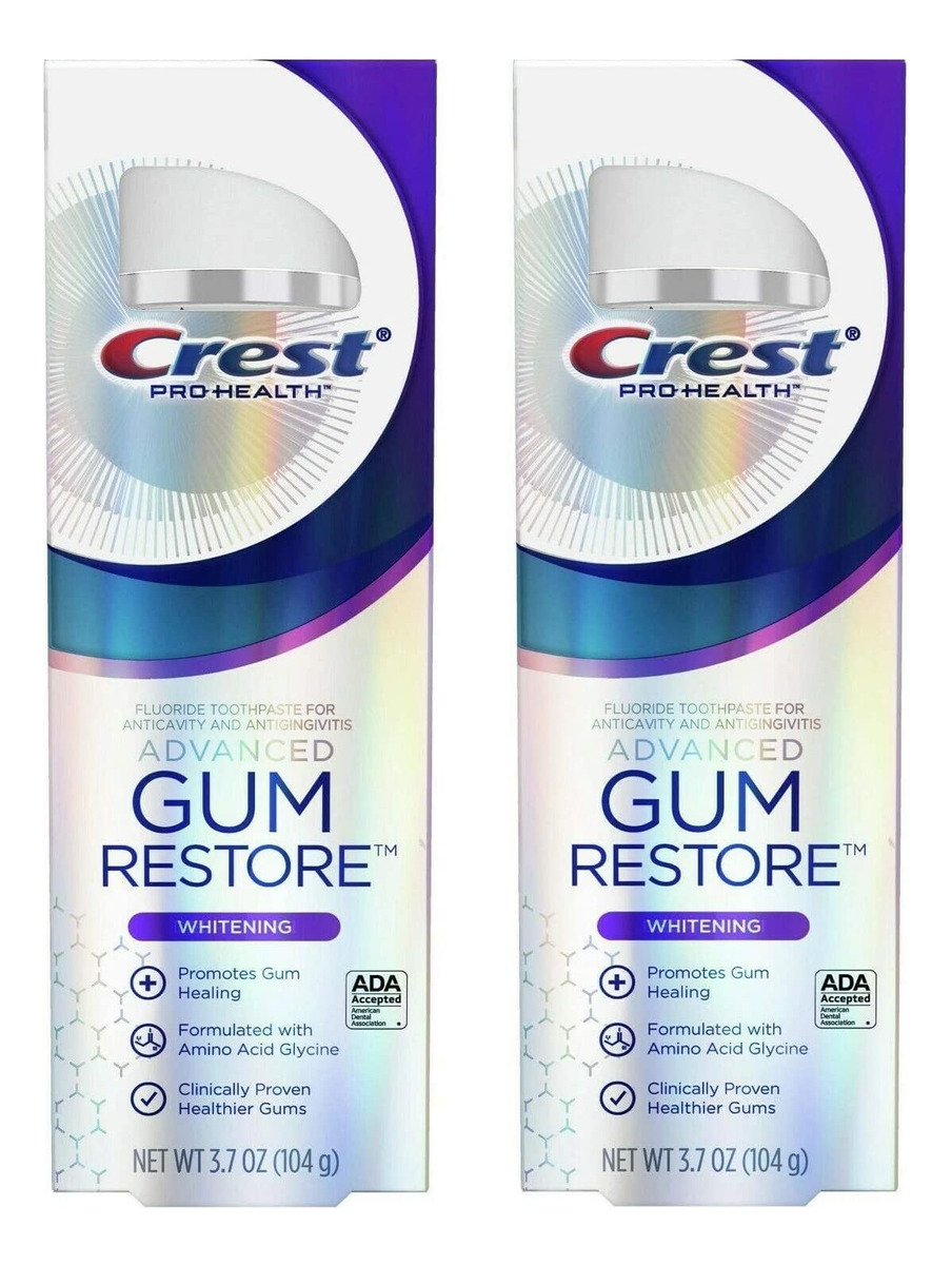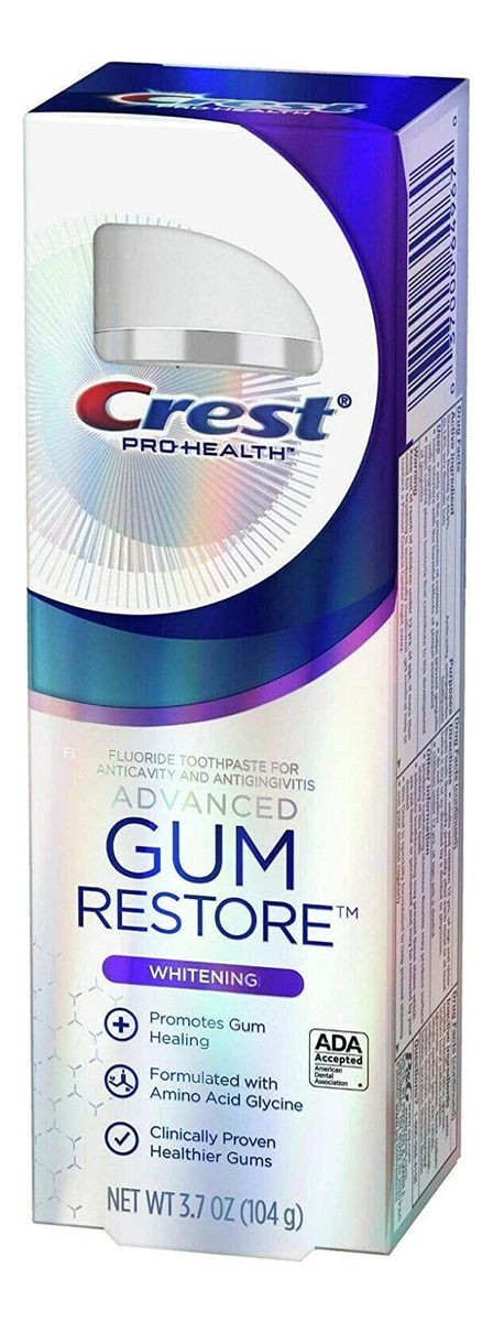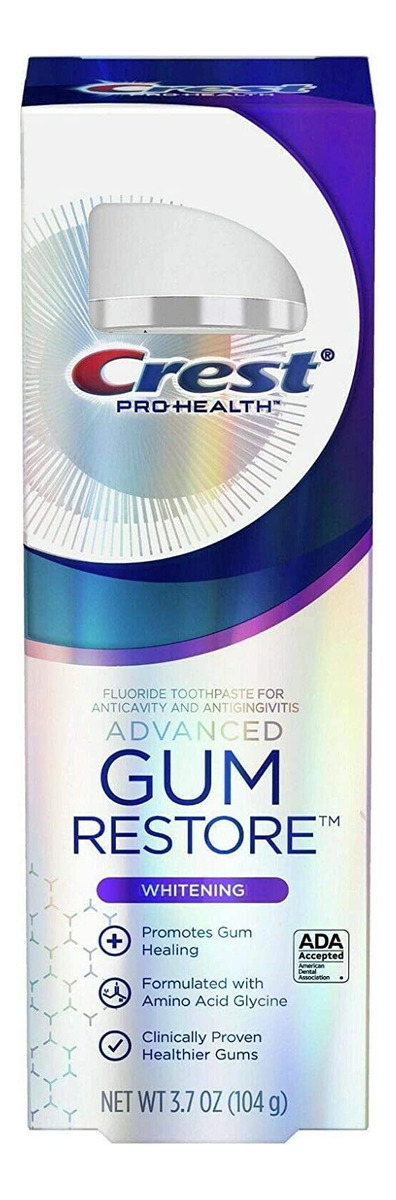 Gengivas clinicamente comprovadas como saudáveis e um sorriso mais branco* e brilhante. O creme dental branqueador Crest Pro-Health Advanced Gum Restore usa uma fórmula de aminoácidos para promover a cicatrização da gengiva em apenas 7 dias**. Contém flúor estanoso para proteção anticavitária e antigengivite. Ajuda a restaurar as gengivas para um sorriso mais saudável. *remoção de manchas superficiais**tratando a gengivite. Você receberá (2) tubos de 3,7 onças de creme dental branqueador Crest Pro-Health Advanced Gum Restore. Formulado com aminoácido glicina. Gengivas mais saudáveis em 7 dias, tratando a gengivite. Contém flúor estanoso como tratamento contra cáries e gengivite. Branquea* dentes para um sorriso mais brilhante* remoção de manchas superficiais. Aprovado pela American Dental Association (ADA). – Creme dental branqueador: a fórmula clareadora avançada ajuda a remover manchas e clarear os dentes. – Marca Crest: marca confiável de higiene bucal conhecida pela qualidade e eficácia. – Fórmula para cuidados com as gengivas: ingredientes especiais ajudam a acalmar e proteger as gengivas. – Aroma Minty Fresh: o sabor fresco de menta deixa os dentes limpos e revigorados. – Embalagem em tubo: o conveniente pacote de 2 tubos permite fácil armazenamento e compartilhamento.
