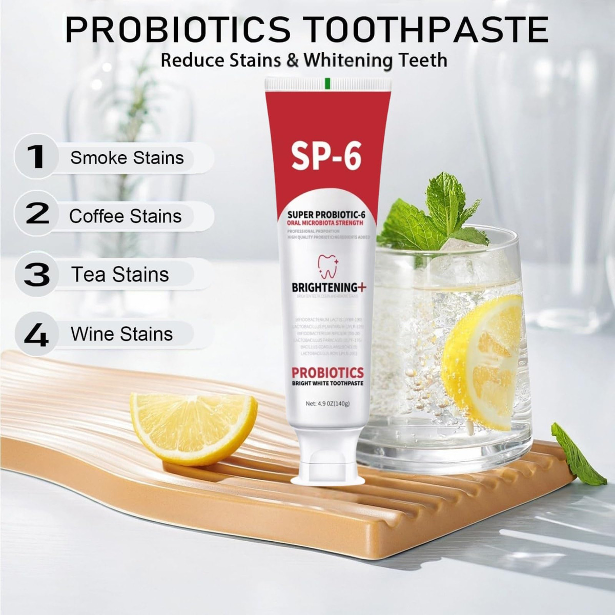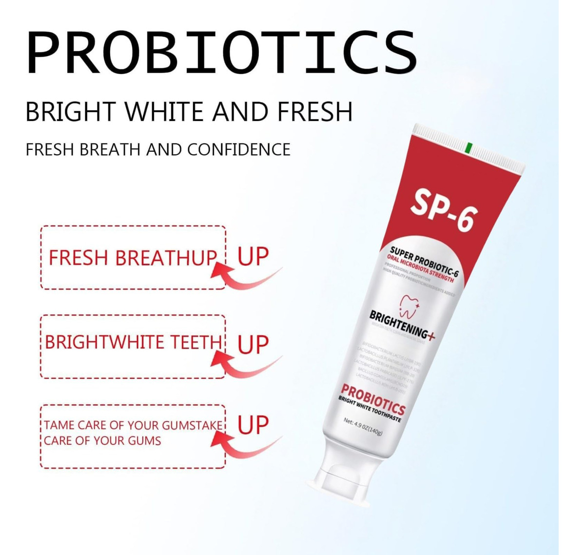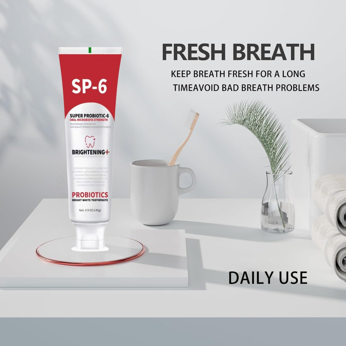 Creme dental branqueador probiótico SP-6, para clareamento dentário e saúde gengival, fórmula aprimorada com 6 probióticos, sem flúor, sabor fresco de menta, 4,9 onças – Pasta de dente SP-6: esta fórmula aprimorada com 6 probióticos, melhora efetivamente as manchas superficiais, reduz o odor oral, previne a cárie dentária e protege a saúde bucal – Fórmula suave: esta fórmula é suave para dentes sensíveis, tornando-a ideal para o uso diário sem causar irritação. Feito com uma fórmula natural, oferece proteção total para suas gengivas e dentes – Dentes profundamente limpos: este creme dental ajuda a limpar os dentes com eficácia, remover partículas de alimentos e manchas profundas embutidas neles – Frescor duradouro: este creme dental mantém seu hálito refrescante, o sabor fresco de menta deixa seu hálito revigorado por horas – Fácil de usar: basta apertar levemente, aplicar um pedaço de pasta de dente na escova de dentes e escovar como de costume. Escove os dentes com ele por 3 minutos, duas vezes ao dia, para obter melhores resultados