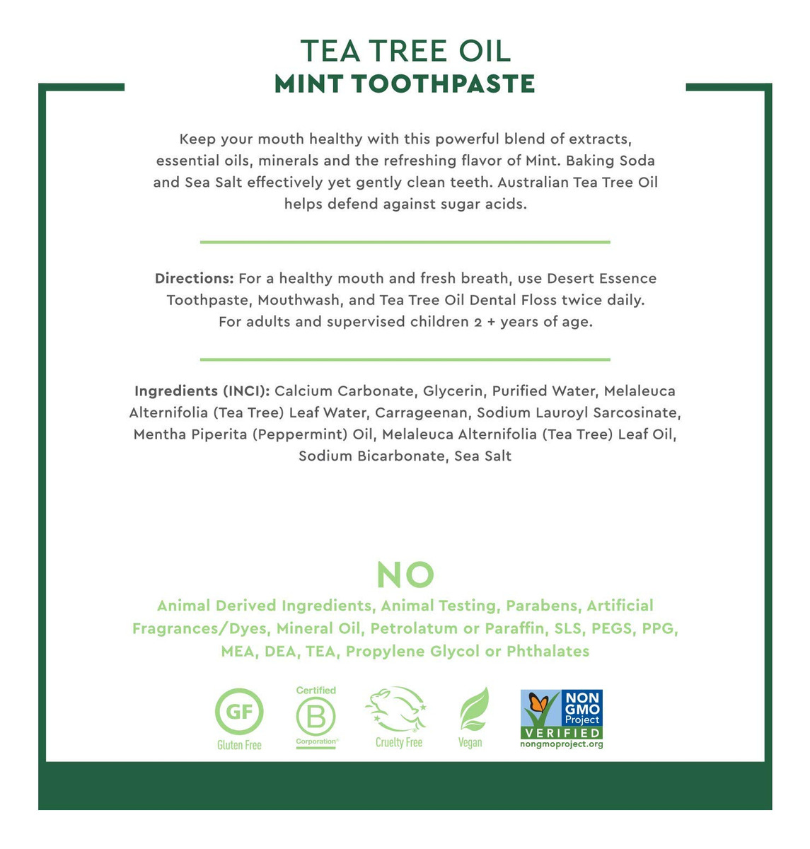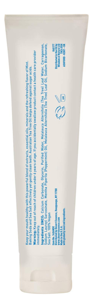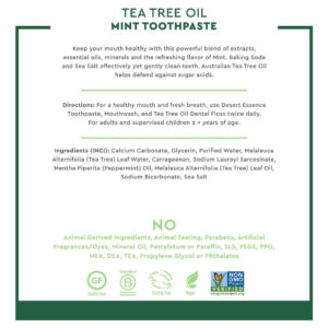 Pasta de dente com óleo de melaleuca Desert Essence — Menta — 6,25 onças — Sabor refrescante — Limpa profundamente dentes e gengivas — Ajuda a combater a placa bacteriana — Sal marinho — Óleo essencial puro — Bicarbonato de sódio — Promove a saúde da boca — DENTES E GENGIVAS SAUDÁVEIS — Pasta de dente sem flúor formulada com óleo de melaleuca australiano puro e bicarbonato de sódio. Oferece cuidados botânicos para dentes e gengivas saudáveis, enquanto refresca o hálito com óleo de menta puro. – O PODER DAS PLANTAS – Remova as impurezas e mantenha o hálito fresco com o potente poder das plantas. Nossos cremes dentais não são certificados pelo projeto GMO e não contêm flúor para sua tranquilidade. – LIMPA SEM FLÚOR – Extratos à base de plantas dão a esse creme dental sem flúor seu poder de limpeza inerente. O bicarbonato de sódio e o sal marinho ajudam suavemente a eliminar a placa bacteriana, enquanto o óleo de melaleuca Australian Eco-Harvest ajuda a combater os ácidos de açúcar formadores de cáries. Deixa os dentes limpos e o hálito fresco com óleo de menta puro. – REMOVA A PLACA BACTERIANA E AS IMPUREZAS – Uma combinação de óleo de melaleuca, extrato vegetal 100% australiano puro, apreciado por seus abundantes benefícios de limpeza e clarificação. Emparelhado com bicarbonato de sódio, um ingrediente comumente usado que ajuda a remover impurezas, combater manchas e neutralizar os ácidos da placa. Óleo essencial refrescante e revigorante de menta que estimula e acalma. – FEITO COM RESPONSABILIDADE – Certificado como vegano, não transgênico, sem glúten e sem crueldade, feito nos EUA com ingredientes de origem global. Feito sem corantes, sabores ou SLS artificiais.