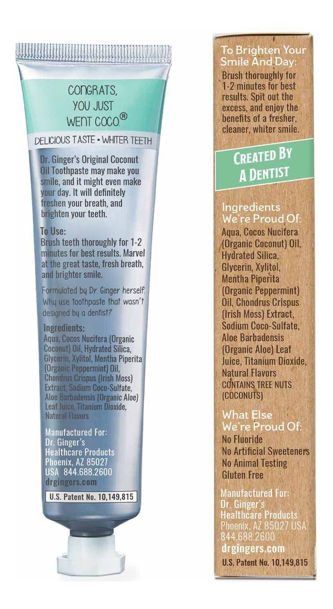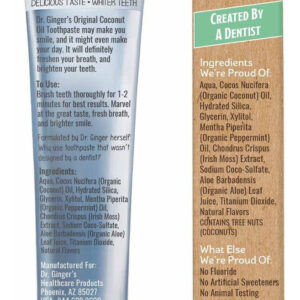 Pasta de dente com óleo de coco Dr. Ginger's, extração de óleo totalmente natural e xilitol para hálito fresco, saúde gengival, prevenção de placa bacteriana e dentes sensíveis, sem flúor, sabor de coco e menta, 4 onças, 1 ct — PASTA DE DENTE COM ÓLEO DE COCO DR. GINGER Uma pasta de dente premium única, feita com óleo de coco orgânico e xilitol que aborda a higiene bucal de uma forma totalmente nova; reveste os dentes em uma camada luxuosamente lisa que protege as gengivas, repele o mau hálito e branqueia os dentes. Sem ingredientes desnecessários ou sabores exagerados. A embalagem inclui um tubo de 4 onças, 1 quilate — FRESCO E SABOROSO. O método de extração do óleo de coco interrompe agressivamente o acúmulo de placa bacteriana para manter um ambiente natural saudável. As técnicas antiplaca ajudam a fortalecer os dentes e a remover o tártaro. O sabor de coco e menta refresca o hálito e deixa a boca limpa e viva novamente – PERFEITO PARA SORRIDENTES SENSÍVEIS. A fórmula suave foi projetada para acalmar e confortar a sensibilidade. O creme dental do Dr. Ginger protege as gengivas da vermelhidão e inflamação. É fácil de aplicar o esmalte dentário e elimina qualquer desconforto. Uma ótima alternativa saudável para seu bem-estar geral – ESCOLHA O NATURAL Nossos ingredientes naturais de alto desempenho criam um microbioma oral saudável e livre de danos. Todos os produtos da Dr. Ginger são feitos sem flúor, sem glúten, sem álcool, sem crueldade, sem transgênicos e livres de outros ingredientes ruins comuns. A Dra. Ginger acredita que uma receita de origem natural é obrigatória para a integridade de um lindo sorriso – FORMULADA PELO DENTISTA A Dra. Ginger DDS, uma renomada dentista estética, ajuda pacientes a se apaixonarem por seus sorrisos há mais de 35 anos. Depois de considerar a demanda dos pacientes por cuidados bucais totalmente naturais, o Dr. Ginger formulou a poderosa mistura de ingredientes de óleo de coco e xilitol. Esses ingredientes principais criam um método simples, fácil e limpo para um ambiente bucal livre de danos. Formulado e testado clinicamente pelos melhores químicos dos EUA