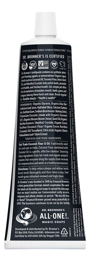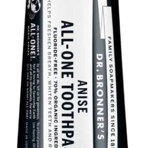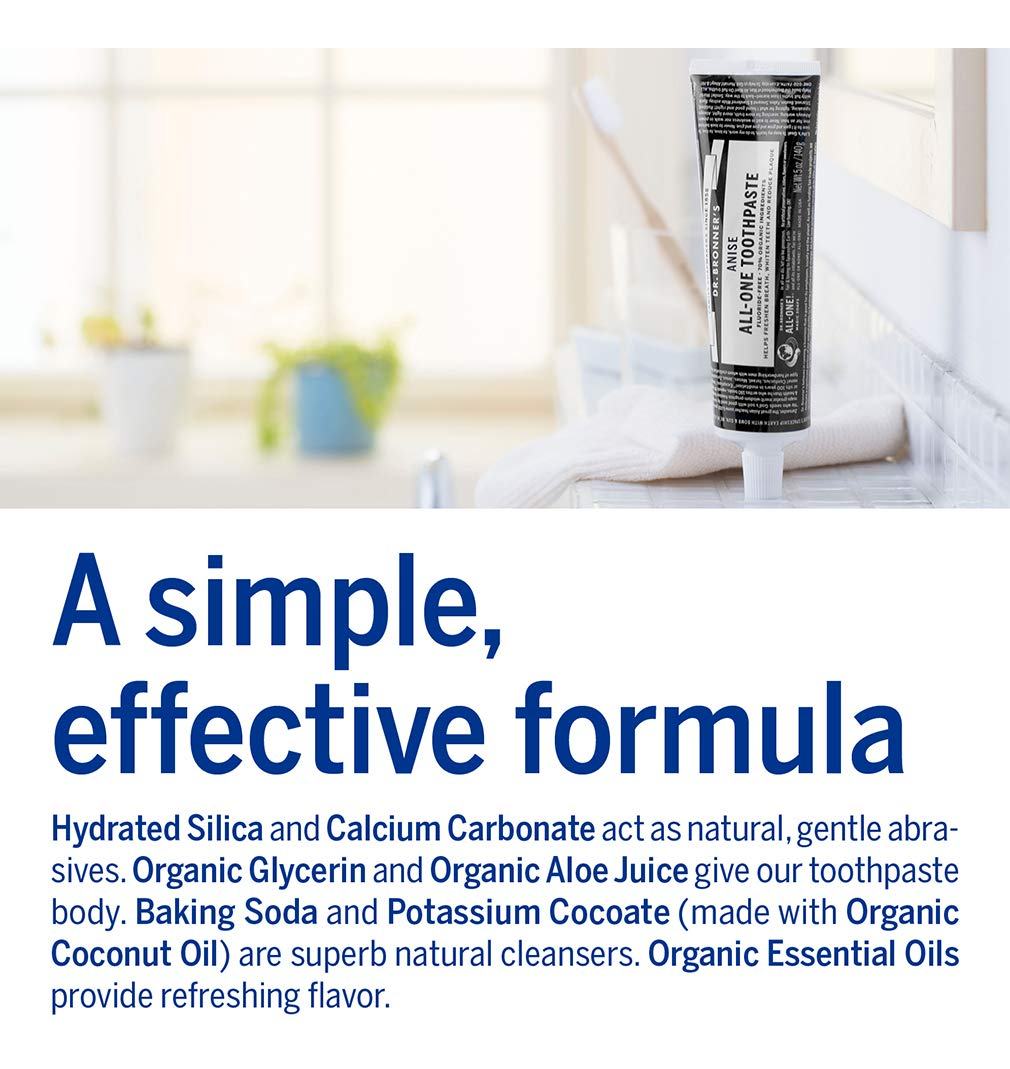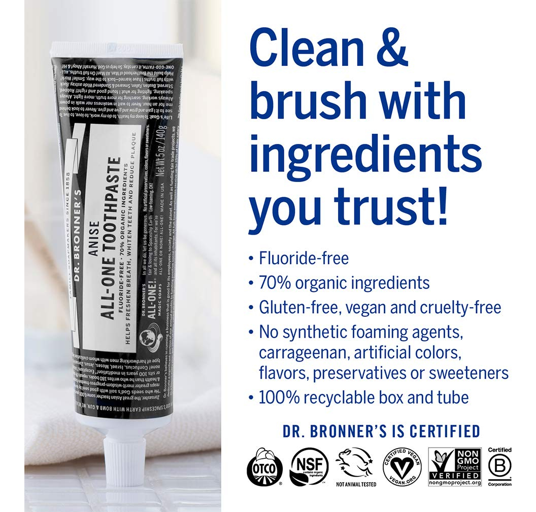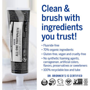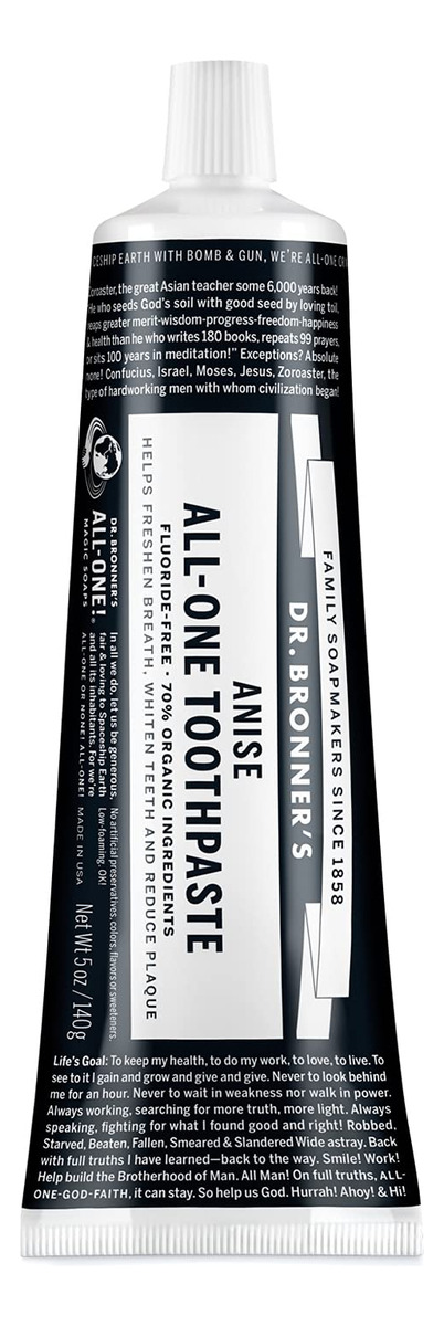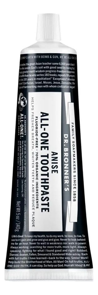 Dr. Bronners — Creme dental completo (anis, 5 onças) — 70% de ingredientes orgânicos, naturais e eficazes, sem flúor, sem SLS, ajuda a refrescar o hálito, reduzir a placa bacteriana, clarear os dentes, vegano — FEITO COM INGREDIENTES ORGÂNICOS E DE COMÉRCIO JUSTO: O creme dental completo Dr. Bronner é feito com 70% de ingredientes orgânicos. Nossa fórmula de baixa espuma ajuda a clarear os dentes, reduzir a placa bacteriana e refrescar o hálito. – Sem espuma sintética AGENTES: Sem laurilsulfato de sódio, lauroilsarcosinato de sódio, laurilsulfato de amônio, metil cocoil tauratenona de sódio! Sem cores, sabores, conservantes ou adoçantes artificiais. Livre de flúor e crueldade! – UMA FÓRMULA SIMPLES: A sílica hidratada e o carbonato de cálcio atuam como abrasivos naturais e suaves; o bicarbonato de sódio e o cocoato de potássio (feitos com óleo de coco orgânico) são excelentes limpadores naturais; os óleos essenciais orgânicos fornecem um sabor refrescante. É simples assim! – POR QUE CREME DENTAL SEM FLÚOR: Pesquisas mostram que os americanos estão recebendo flúor mais do que suficiente por meio da fluoretação da água. O Dr. Bronner's fornece um creme dental eficaz sem flúor para consumidores que desejam reduzir a ingestão de flúor – NOSSO CREME DENTAL É LIVRE DE CRUELDADE E NUNCA FOI TESTADO EM ANIMAIS: os produtos e ingredientes do Dr. Bronner nunca são testados em animais, então eles se qualificam para o logotipo Leaping Bunny. Finalmente, uma pasta de dente que corresponde aos seus valores!