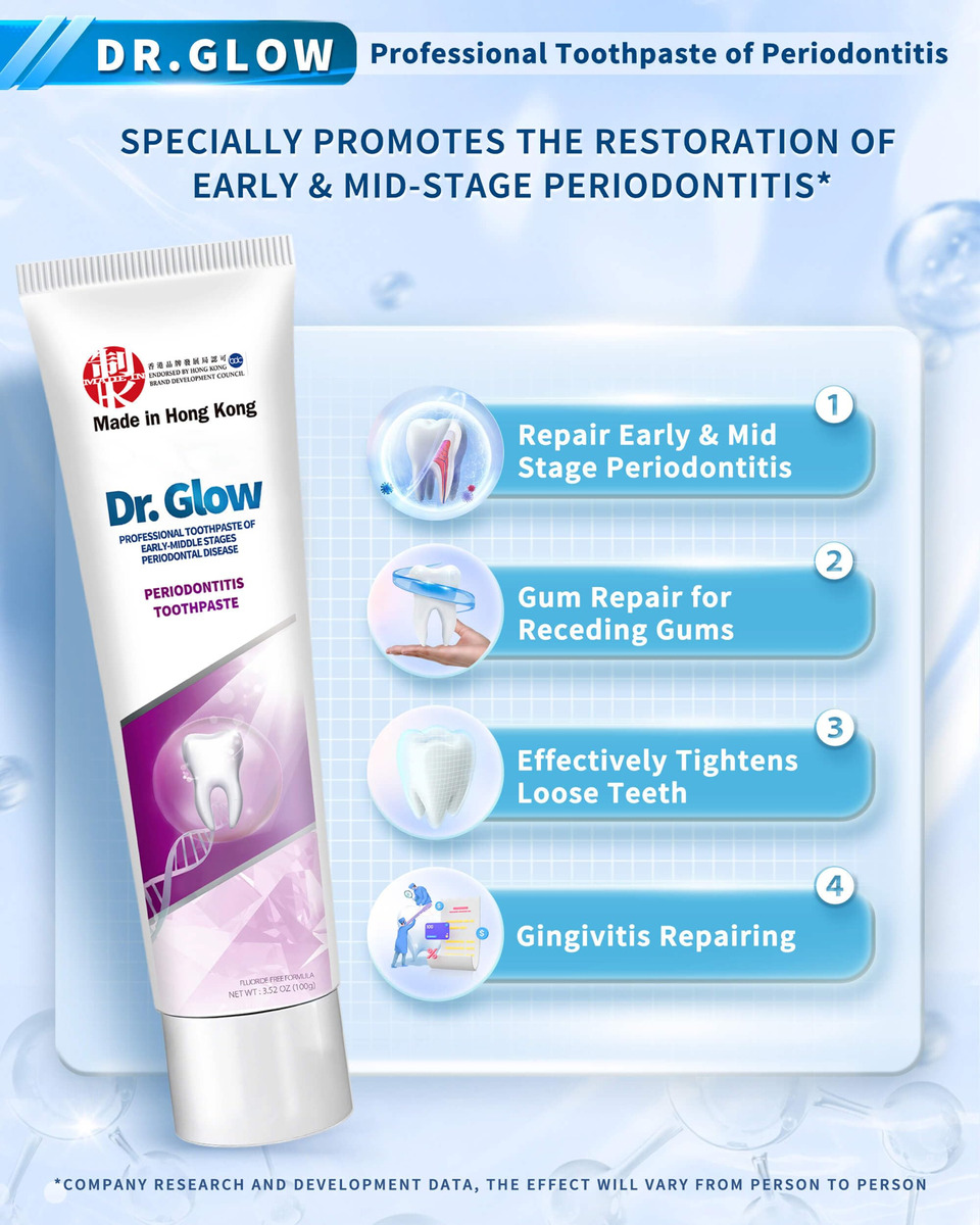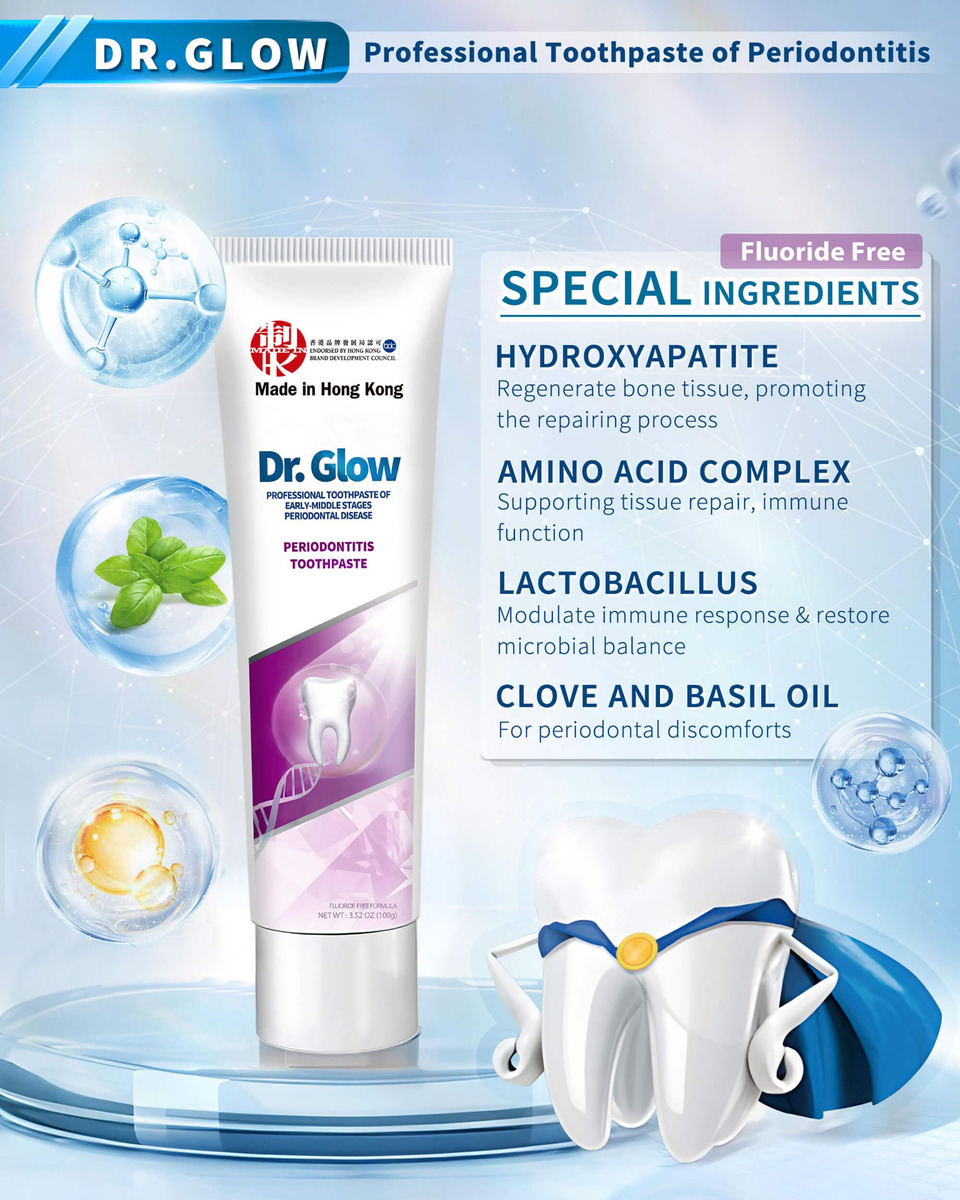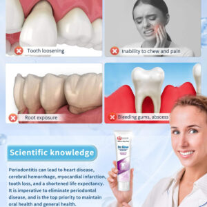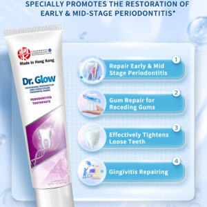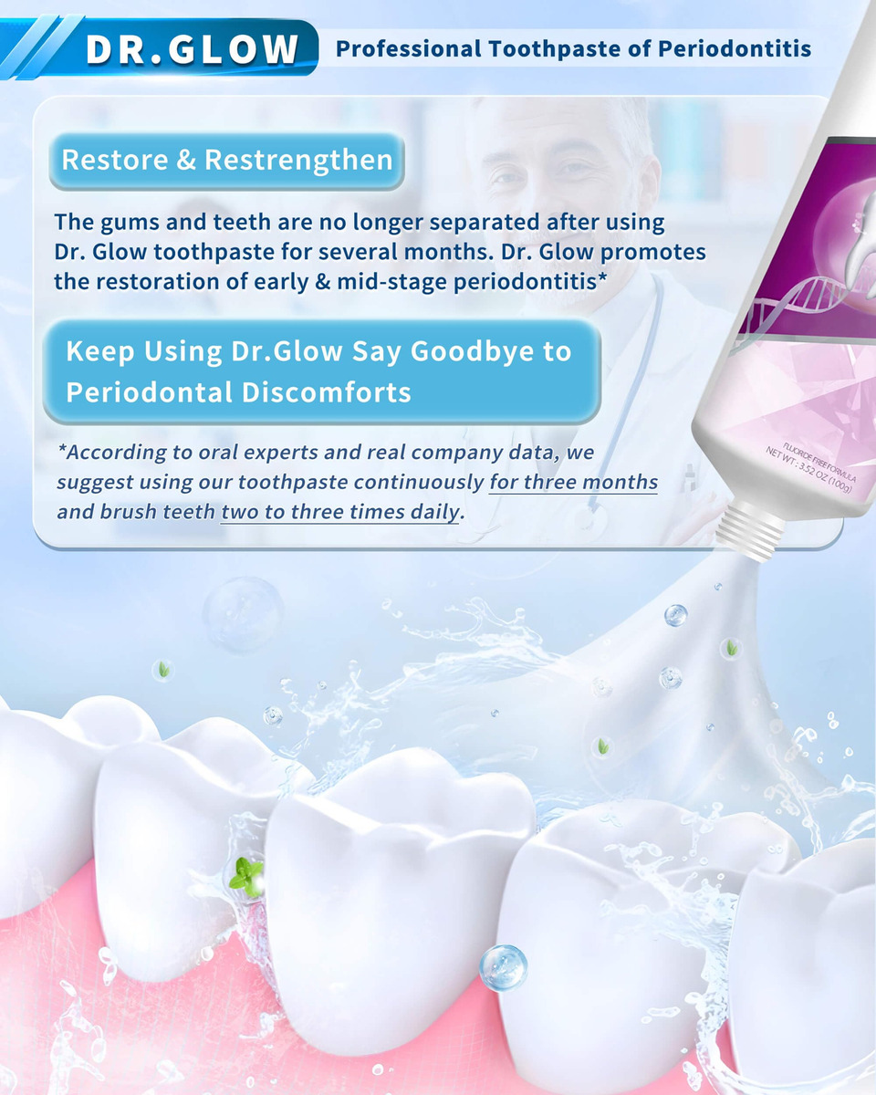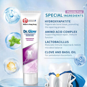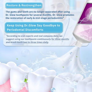 tratamento da doença periodontal creme dental reparador de gengivas – 1. Tratamento de gengivite e doenças periodontais: o creme dental reparador de gengivas Dr. Glow contém ingredientes eficazes contra a gengivite e o desconforto da doença periodontal em médio-início; penetra profundamente nos tecidos gengivais para reduzir o inchaço, a sensibilidade, o sangramento e a retração gengival; repara e recupera o tecido gengival; promove a saúde gengival a longo prazo; ajuda a prevenir o retorno da doença gengival – 2. Removedor de placa dura (limpeza profunda): este creme dental para gengivite oferece recursos de limpeza profunda; atinge as superfícies dos dentes e áreas abaixo da linha da gengiva; remove eficazmente o tártaro persistente; evita o acúmulo de placa; reduz a frequência de doenças gengivais; promove uma boca mais limpa e saudável com o uso regular – 3. Osso alveolar remineralizante, reparo de dentes soltos: o creme dental de hidroxiapatita Dr. Glow foi desenvolvido para reparar danos ósseos alveolares e dentes soltos causados pela doença periodontal; a hidroxiapatita fortalece o osso; promove a estabilidade e regeneração do osso alveolar; torna os dentes mais fortes e duráveis – 4. Tratamento do mau hálito, refresque o hálito: desenvolvido cientificamente para combater o mau hálito causado por doenças gengivais; o creme dental que restaura a gengiva elimina os resíduos alimentares orais responsáveis por odores desagradáveis; a ação de limpeza profunda evita o crescimento de micróbios; garante um hálito fresco de longa duração; ajuda você a recuperar a confiança com uma boca limpa e fresca – 5. Fórmula suave: sem flúor, sem SLS: este tratamento para periodontite apresenta uma fórmula suave e não irritante, ideal para o cuidado diário de gengivas sensíveis; sem flúor e sem SLS; fornece proteção eficaz sem causar mais irritação; garante conforto ideal durante o uso regular; promove a saúde da gengiva; mantém os dentes limpos e saudáveis por mais tempo