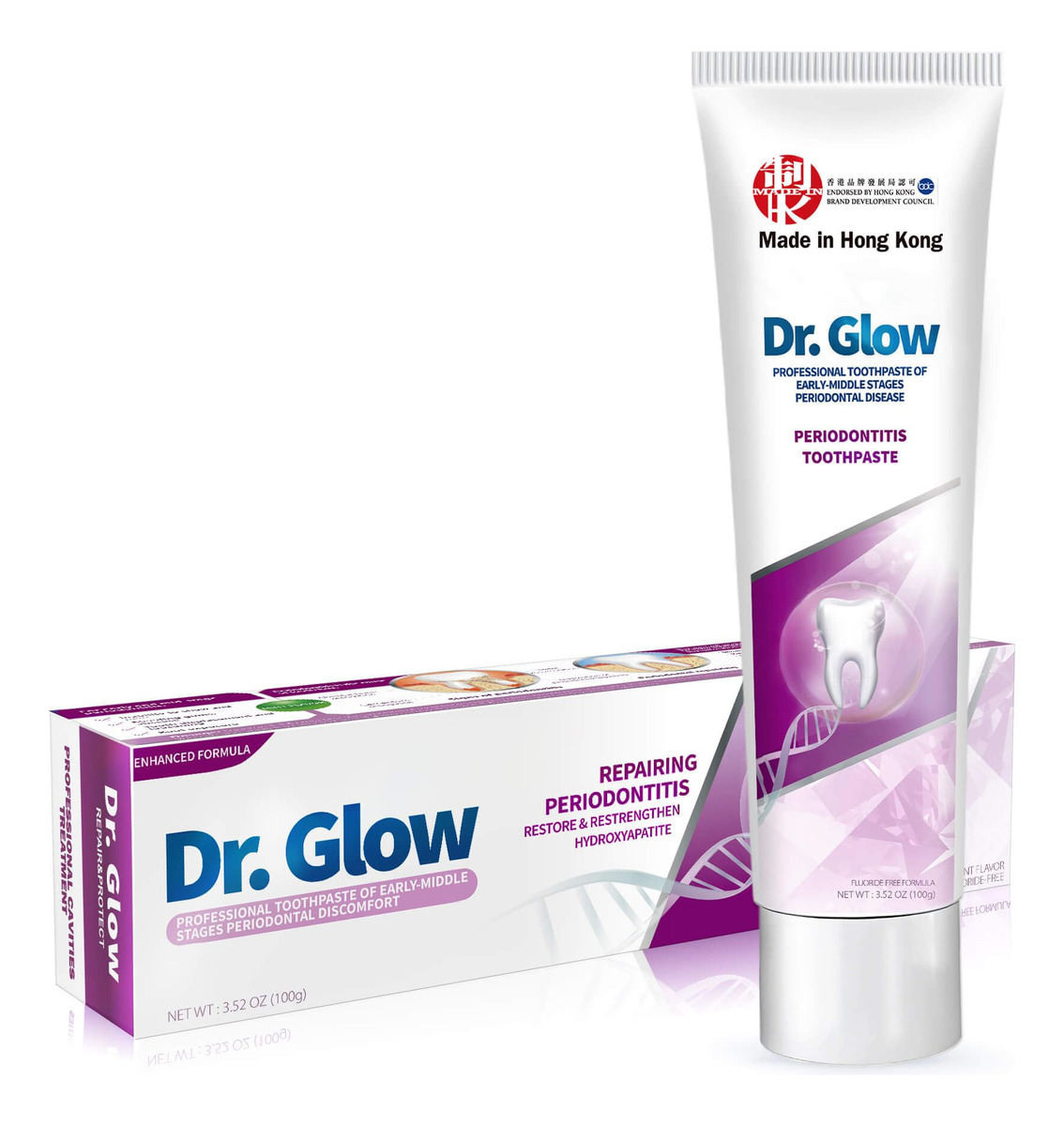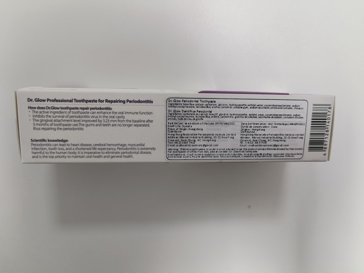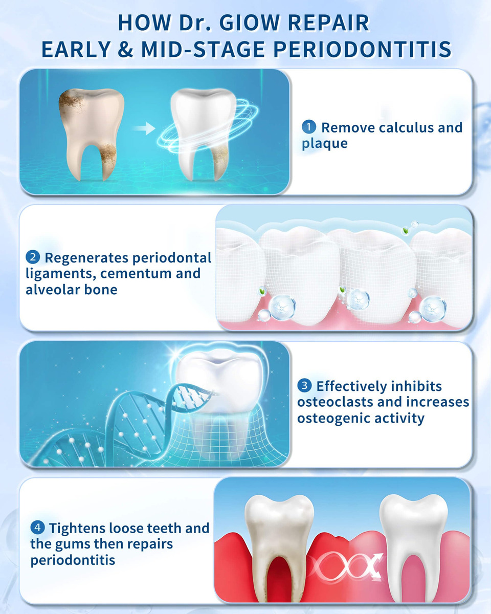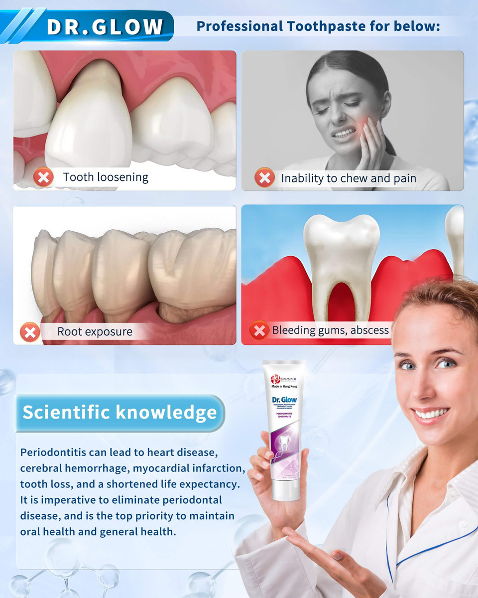 tratamento da doença periodontal creme dental reparador de gengivas – 1. Tratamento de gengivite e doenças periodontais: o creme dental reparador de gengivas Dr. Glow contém ingredientes eficazes contra a gengivite e o desconforto da doença periodontal em médio-início; penetra profundamente nos tecidos gengivais para reduzir o inchaço, a sensibilidade, o sangramento e a retração gengival; repara e recupera o tecido gengival; promove a saúde gengival a longo prazo; ajuda a prevenir o retorno da doença gengival – 2. Removedor de placa dura (limpeza profunda): este creme dental para gengivite oferece recursos de limpeza profunda; atinge as superfícies dos dentes e áreas abaixo da linha da gengiva; remove eficazmente o tártaro persistente; evita o acúmulo de placa; reduz a frequência de doenças gengivais; promove uma boca mais limpa e saudável com o uso regular – 3. Osso alveolar remineralizante, reparo de dentes soltos: o creme dental de hidroxiapatita Dr. Glow foi desenvolvido para reparar danos ósseos alveolares e dentes soltos causados pela doença periodontal; a hidroxiapatita fortalece o osso; promove a estabilidade e regeneração do osso alveolar; torna os dentes mais fortes e duráveis – 4. Tratamento do mau hálito, refresque o hálito: desenvolvido cientificamente para combater o mau hálito causado por doenças gengivais; o creme dental que restaura a gengiva elimina os resíduos alimentares orais responsáveis por odores desagradáveis; a ação de limpeza profunda evita o crescimento de micróbios; garante um hálito fresco de longa duração; ajuda você a recuperar a confiança com uma boca limpa e fresca – 5. Fórmula suave: sem flúor, sem SLS: este tratamento para periodontite apresenta uma fórmula suave e não irritante, ideal para o cuidado diário de gengivas sensíveis; sem flúor e sem SLS; fornece proteção eficaz sem causar mais irritação; garante conforto ideal durante o uso regular; promove a saúde da gengiva; mantém os dentes limpos e saudáveis por mais tempo