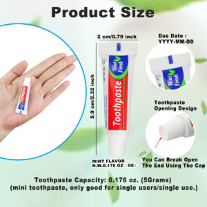 Sabor: Pasta de dente leve com sabor de menta Tamanho de viagem: Capacidade: 0,176 onças (5g), (pasta de dente pequena, válida apenas para usuários individuais/uso único). Nota: A capacidade da pasta de dente é relativamente pequena. Por favor, confirme a capacidade antes de comprar! Embalagem: Embalagem independente Fácil de transportar: adequada para transportar, malas de viagem, carteiras, bolsas de ginástica, armários, escritórios, etc. O pacote inclui 50* Pasta de dente de viagem a granel para mini hotel Característica: 1. Quantidade suficiente para atender às necessidades diárias de reposição de sua família e também conveniente para os hóspedes usarem em casa. 2. Adequado para uso doméstico, bem como suprimentos de hotel e suprimentos domésticos e de viagem. 3. Também pode ser doado a organizações de caridade para melhor contribuir para o bem-estar público. 4. A escova de dentes pode ser colocada em uma bolsa ou mala sem a necessidade de itens compartilhados e pode ser descartada ou limpa após o uso. 5. O mini creme dental tem uma capacidade de 0,176 onças (5g) e pode ser usado 1 a 2 vezes. – ATENÇÃO, POR FAVOR! : A mini pasta de dente tem uma capacidade de apenas 0,176 onças, que é uma pasta de dente muito pequena, boa apenas para usuários individuais/uso único. A mini pasta de dente é muito pequena. Se você se importa, por favor, não compre – PACOTE COM VALOR DE 50 TUBOS: O pacote inclui 50 tubos de pasta de dente pequena de 0,176 oz/5 gramas embalada individualmente. As compras no atacado são mais acessíveis do que as compras individuais! Você pode economizar melhor seu orçamento – Fácil de transportar: o tamanho da pasta de dente para viagens a granel é de 2,28 x 0,78 polegadas, 0,176 onças (5 g) e é conveniente para viagens e férias. O creme dental leve com sabor de menta mantém sua boca fresca e fresca. Adequado para uso por hóspedes ou indivíduos em qualquer hotel – Amplamente utilizado: o creme dental a granel é embalado individualmente e não requer itens compartilhados. Muito adequado para uso em hotéis e motéis, residências, resorts, hotéis, hospedagens domiciliares, VRBO, aluguéis de temporada, companhias aéreas, escritórios, academias, quartos de hóspedes e outros lugares – Suprimentos doados: o creme dental de viagem a granel é ideal para organizações sem fins lucrativos, igrejas, escolas, abrigos para moradores de rua e muito mais. Você pode doar para sua instituição de caridade, abrigo ou organização humanitária favorita – TOOTHPASTE OPEN DESIGN: VOCÊ PODE ABRIR A EXTREMIDADE USANDO A TAMPA