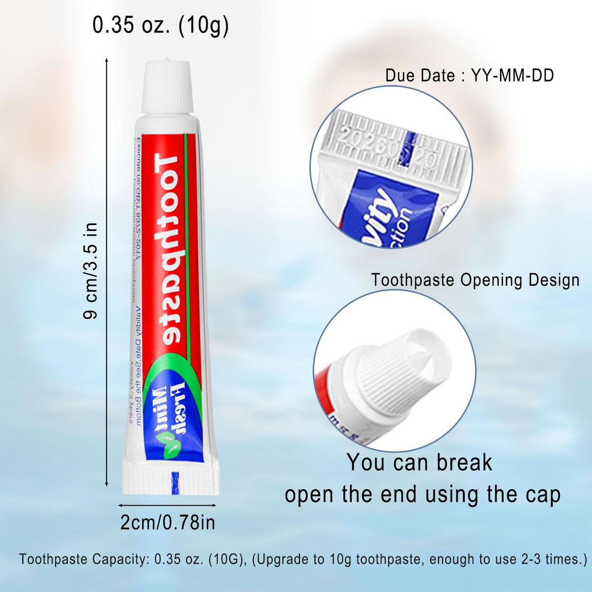 Sabor: Sabor leve de menta Tamanho: 2×9 cm/0,8×3,5 polegadas Capacidade: 0,35 onças (10 G), (atualize para 10 g de pasta de dente de viagem, o suficiente para usar 2 a 3 vezes). Nota: A capacidade da pasta de dente é relativamente pequena. Por favor, confirme a capacidade antes de comprar! Fácil de transportar: adequado para transportar, malas de viagem, carteiras, bolsas de ginástica, armários, escritórios, etc. O pacote inclui 30* Pasta de dente de viagem a granel. Mini característica: 1. Quantidade suficiente para atender às necessidades diárias de reposição de sua família e também é conveniente para os hóspedes usarem em casa. 2. Adequado para uso doméstico, bem como suprimentos para hotéis e suprimentos domésticos e de viagem. 3. Também pode ser doado a organizações de caridade para melhor contribuir para o bem-estar público. 4. A escova de dentes pode ser colocada em uma bolsa ou mala sem a necessidade de itens compartilhados e pode ser descartada ou limpa após o uso. 5. A mini pasta de dente tem uma capacidade de 0,35 onças (10 g) e pode ser usada 2 a 3 vezes. – Pacote com 30 tubos de minipasta de dente embalada individualmente. As compras no atacado são mais acessíveis do que as compras individuais! Você pode economizar melhor seu orçamento. – O creme dental Mint FlavorLight com sabor de menta mantém sua boca fresca e fresca. A boca do tubo tem um design de vedação estável. Proporcione uma experiência de lazer e viagem descontraída e perfeita. – O tamanho da pasta de dente Mini é de 0,8 x 3,5 polegadas, 0,35 onças (10 G) e é conveniente para viagens e férias. Adequado para hóspedes ou indivíduos em qualquer hotel. – O mini creme dental amplamente utilizado é embalado individualmente e não requer itens compartilhados. Muito adequado para uso em hotéis e motéis, residências, resorts, hotéis, hospedagens domiciliares, VRBO, aluguéis de temporada, companhias aéreas, escritórios, academias, quartos de hóspedes e outros lugares. – O creme dental doado SuppliesTravel é ideal para organizações sem fins lucrativos, igrejas, escolas, abrigos para moradores de rua e muito mais. Você pode doar para sua instituição de caridade, abrigo ou organização de ajuda humanitária favorita.