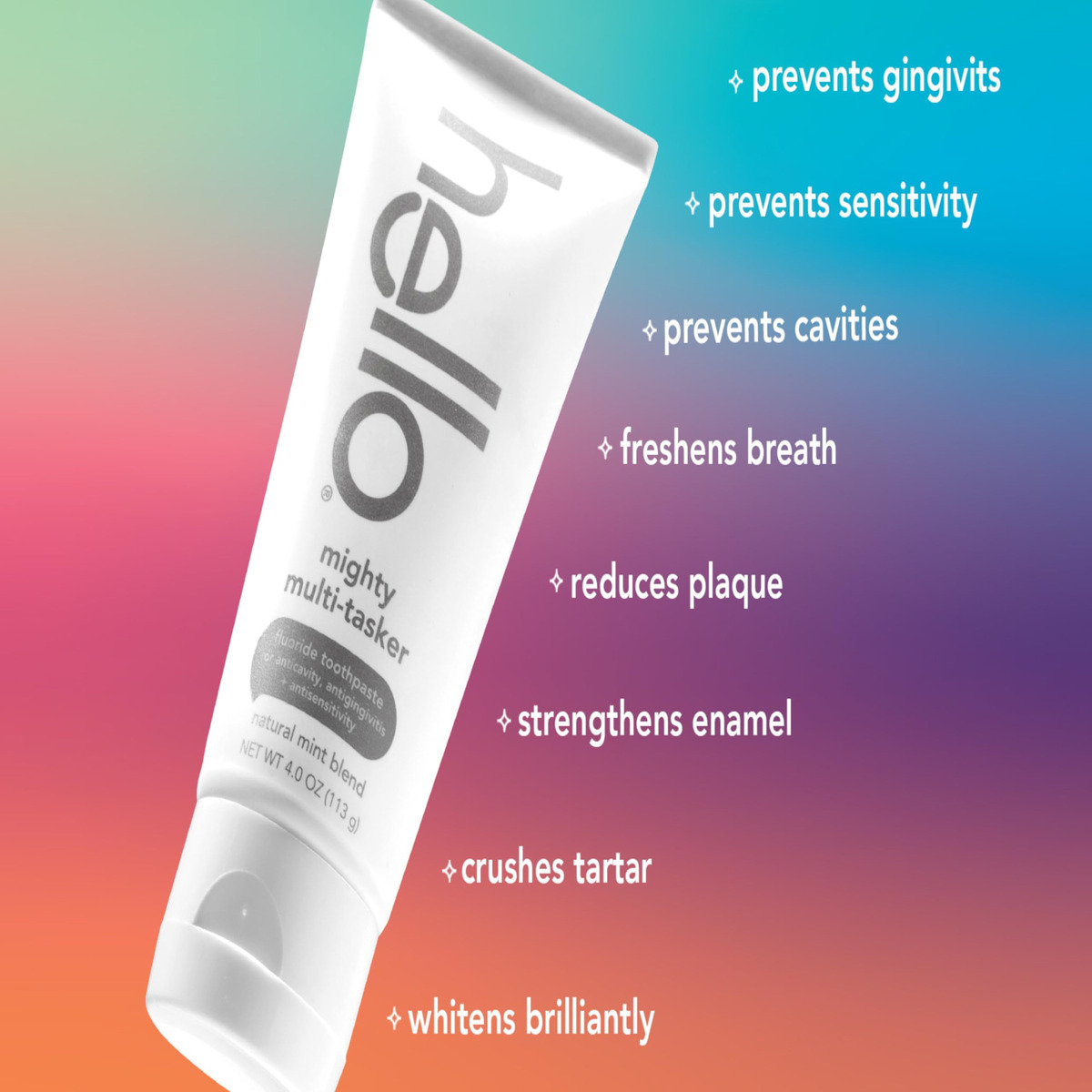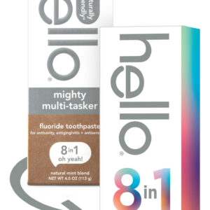 Hello Mighty Multitasker, creme dental com flúor, 8 em 1 com sabor de menta, anticavidade, antigengivite, antissensibilidade, fortalece o esmalte e clareia, tubo de 4,0 onças – este creme dental 8 em 1 evita cáries, gengivite e sensibilidade. Também fortalece o esmalte, embranquece brilhantemente, reduz a placa bacteriana, esmaga o tártaro e refresca o hálito. – A pasta multitarefa hello mighty inclui uma mistura natural de menta para maior comodidade. – esta pasta não contém adoçantes artificiais, sabores artificiais, corantes, SLS, parabenos, conservantes, dióxido de titânio e glúten. claro. – hello é vegano e não foi testado em animais (certificado Leaping Bunny). escolha amigável.